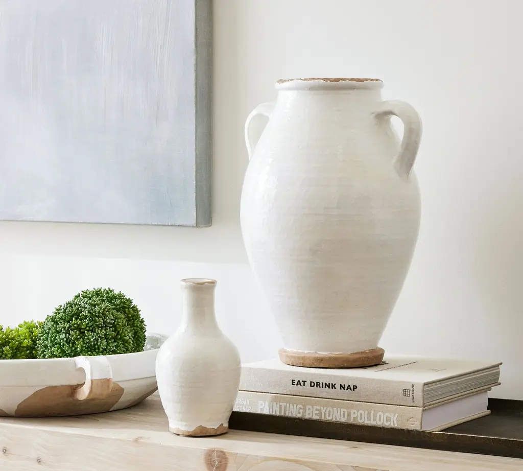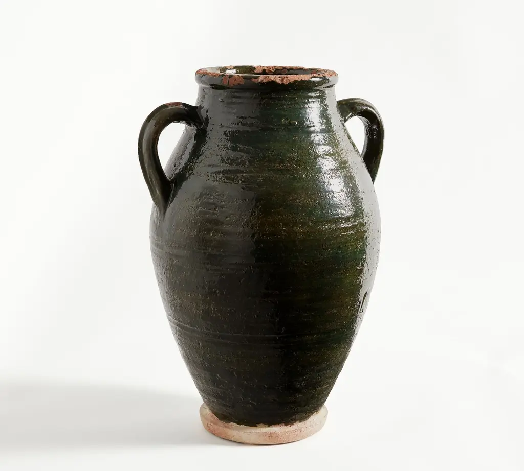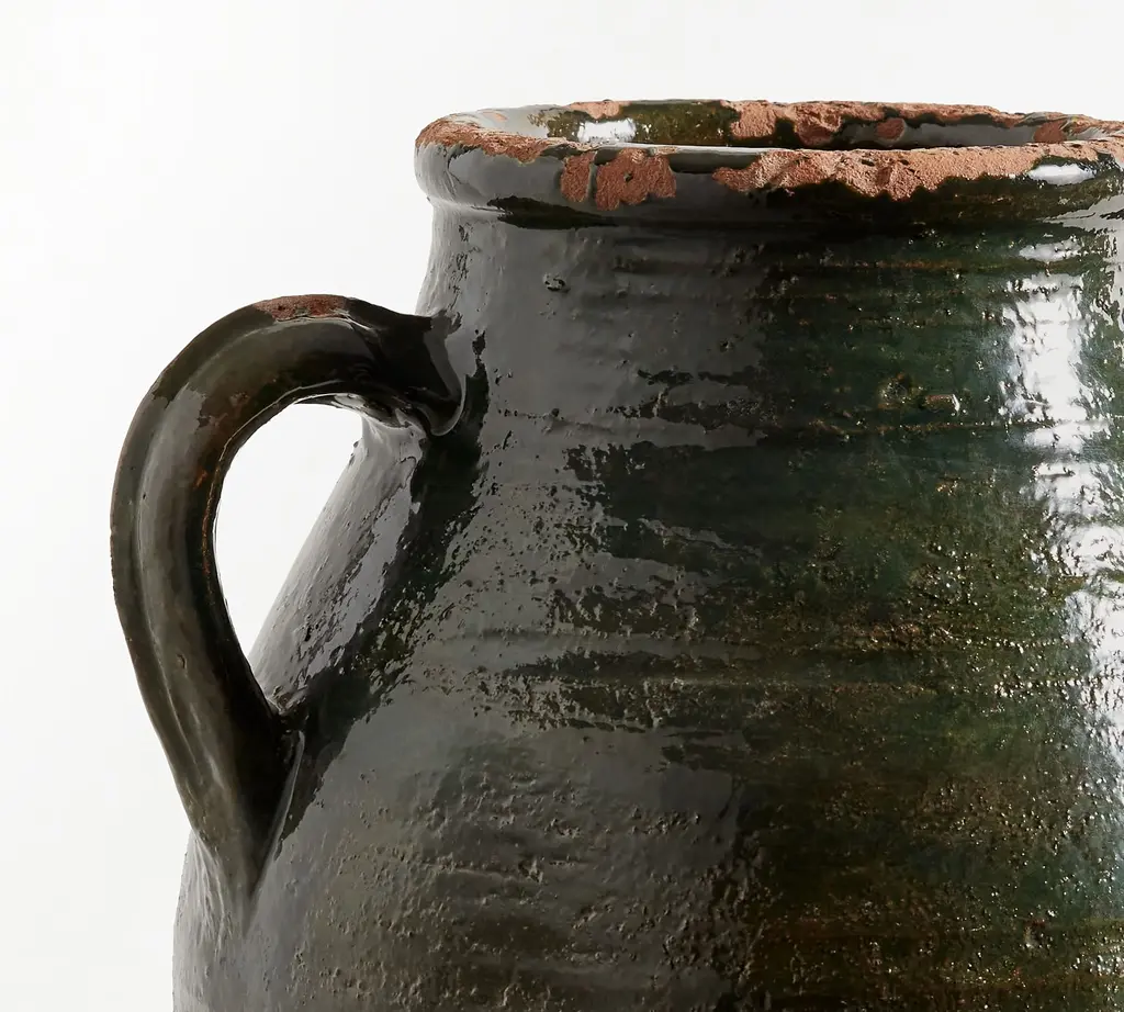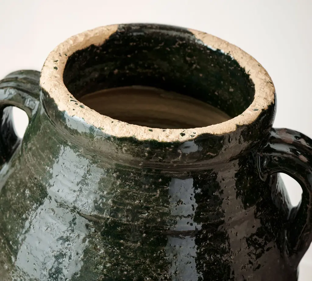 Add an artisanal moment to a console or mantel with these handcrafted, watertight vessels. Resembling ancient Greek ceramics, they juxtapose a glossy glaze with earthenware surfaces. Place them around your home, brimming with flowers and favorite ornaments or standing artfully empty like collected objects.