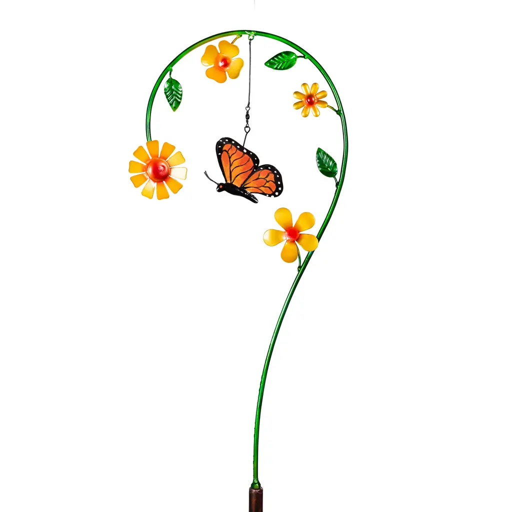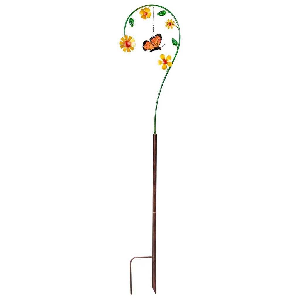 Bring vibrant motion and whimsical charm to your outdoor space with our Butterfly Flower Garden Stake. This eye-catching accent features a beautifully painted butterfly suspended in midair, appearing to flutter toward flowers that climb up a gracefully curved green stem.Crafted of durable recycled metal with hand-painted details, this delightful garden stake adds color, dimension, and movement to flower beds, planters, or pathways—catching sunlight and breezes for a dynamic display.