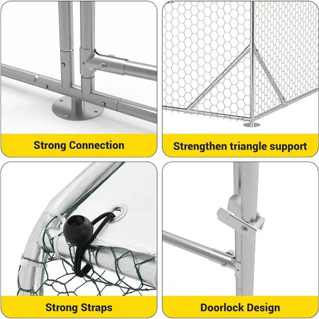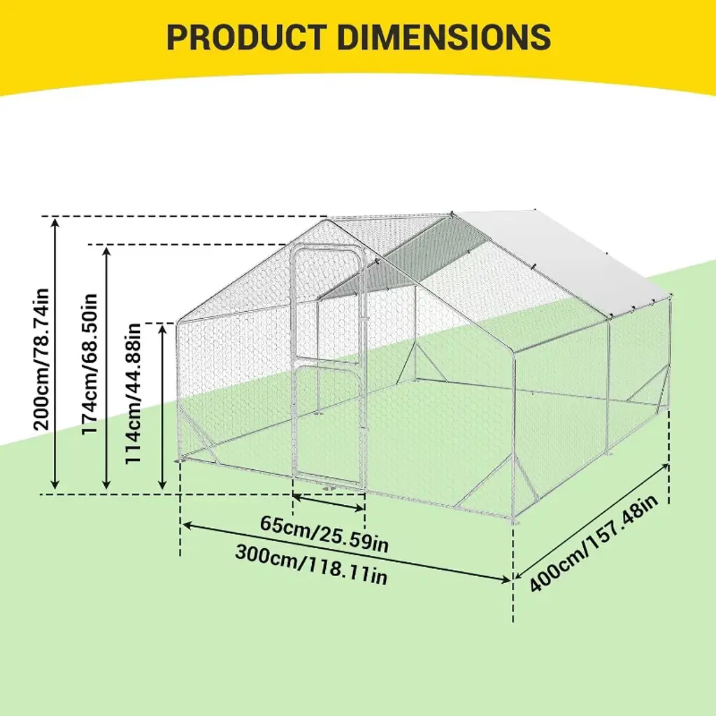 Feature:This chicken coop features a sturdy metal construction, ensuring longevity and resistance to harsh weather conditions.The two lockable doors allow for easy entry and exit, making feeding and cleaning a breeze. You can quickly access your chickens or other small animals without hassle.The stylish sloped roof provides ample headroom for your chickens while allowing rain and snow to slide off easily, keeping the interior dry and comfortable.Equipped with four reinforced straps and triangular support, this chicken run offers enhanced stability and strength, ensuring it withstands the elements and remains secure in your outdoor space.This chicken house provides plenty of room for chickens, ducks, or rabbits to roam freely, promoting their well-being and happiness.Ideal for backyards, farms, and patios, this chicken coop run is the perfect solution for poultry enthusiasts looking to provide a safe and comfortable habitat for their animals. Enjoy the peace of mind that comes with a reliable and stylish poultry cage. Note:Place the coop in a level area with good drainage to prevent water accumulation and ensure a stable foundation.Regularly check all fastenings and connections to ensure they are secure, especially after harsh weather conditions.