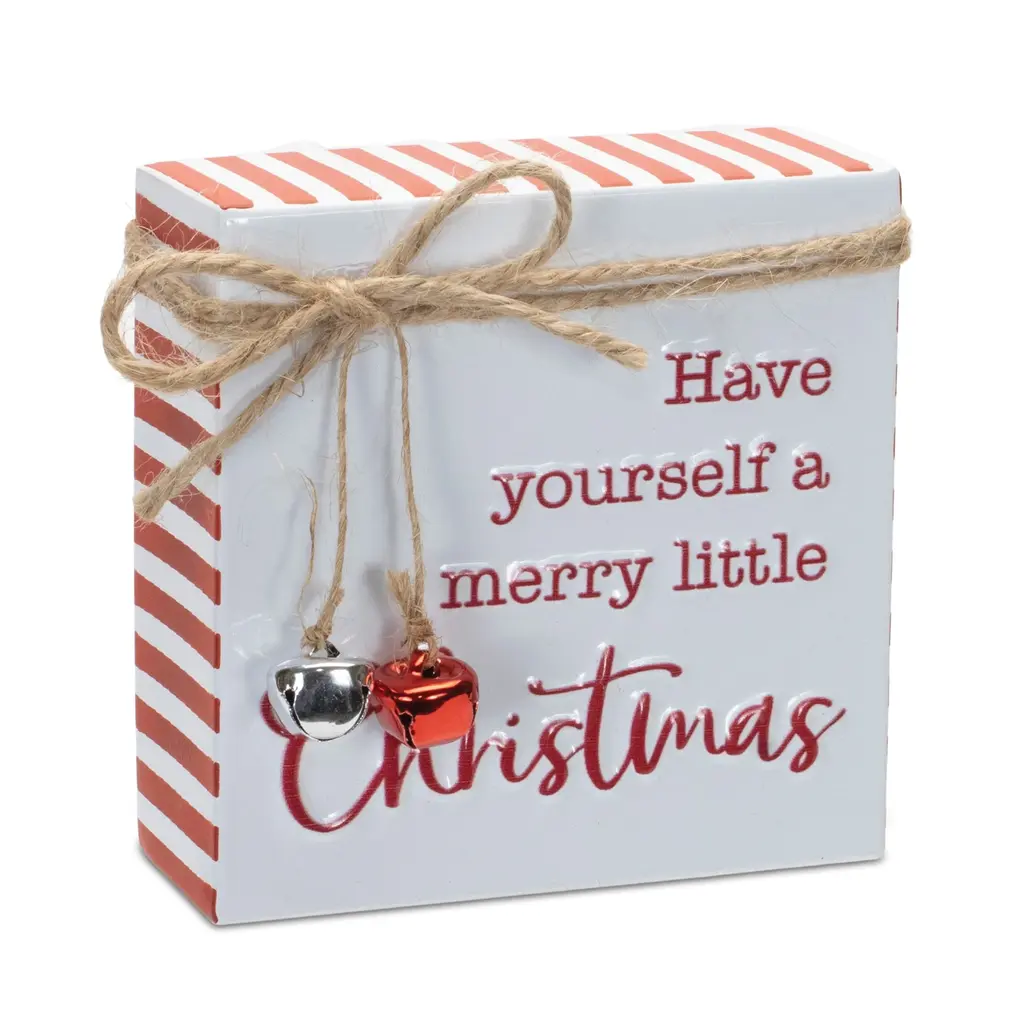 Welcome you guests with this beautiful set of Christmas Sentiment Signs. Featuring two assorted designs, this set is a great addition to your traditional style of holiday decor. The fun "Merry Little Christmas" and "Tis the Season to be Jolly" sentiments paired with the festive red and white tones and sleigh bell accents are the perfect combination to create a memorable display. The quality metal composition is sure to endure for seasons to come. Display the pieces on your mantle of bookshelf to share the message with all!