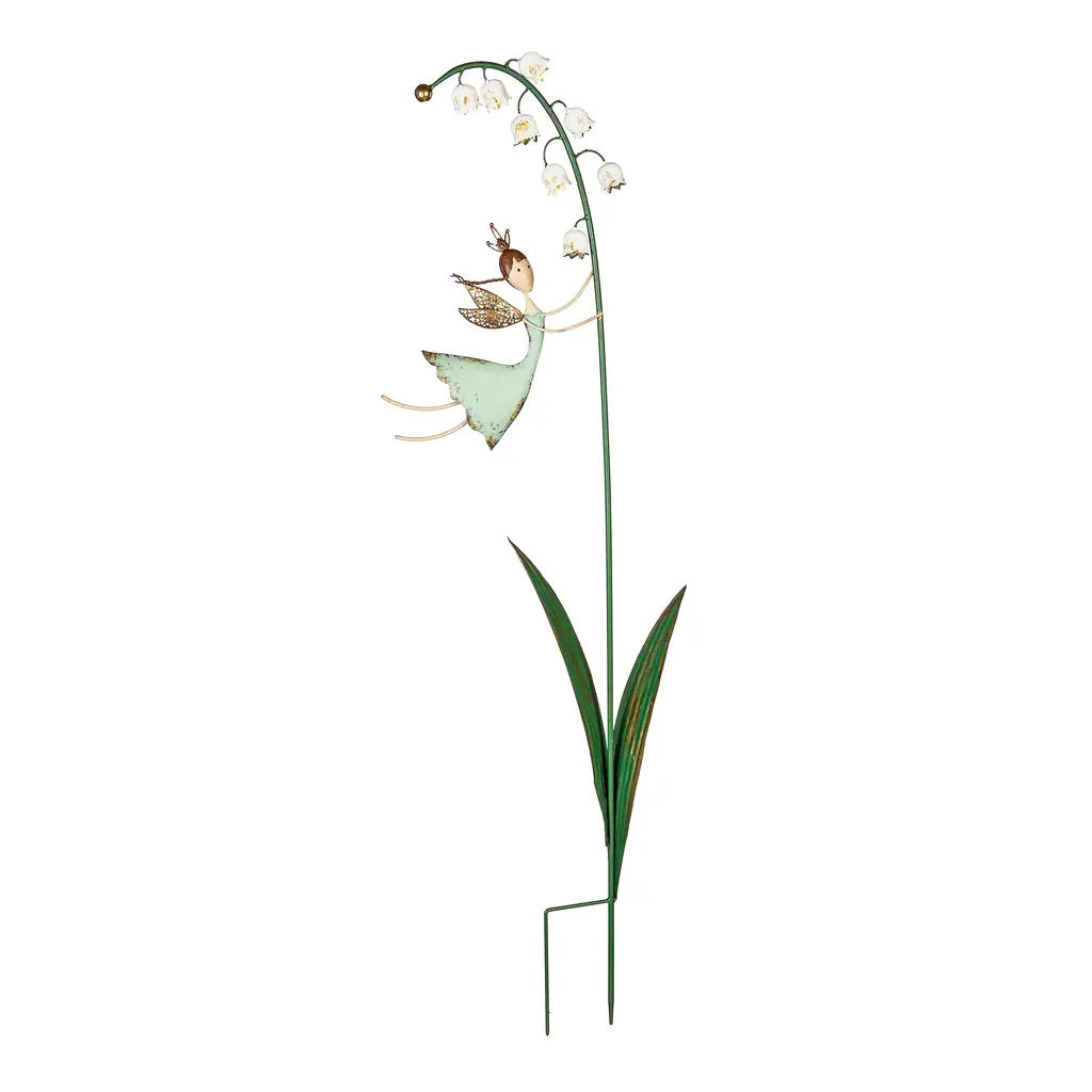 This fairy has been caught in the act! Watch as she “swings” around your garden or yard. Stake this delightful fairy accent into your landscape to add whimsy and fun. Fairy looks like she came straight from a storybook with her pastel dress, crown and sweetly painted face. She has a delicate, hand-painted look with gold lief accenting her wings, leaves and flowers. Crafted of outdoor and weather-safe metal for long-lasting use; h-stake inserts easily into ground.