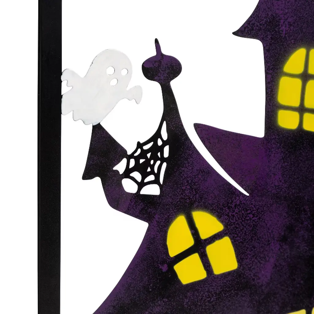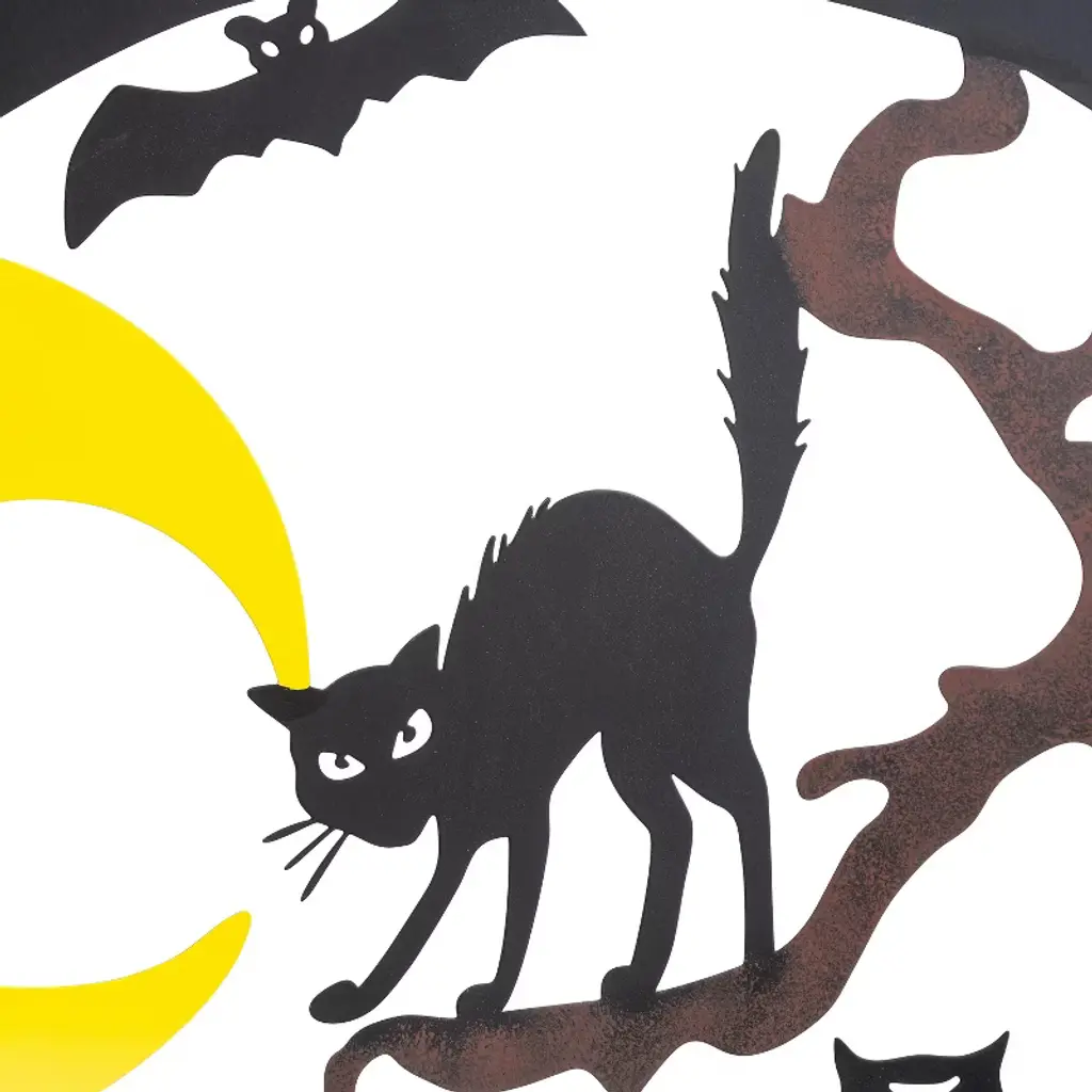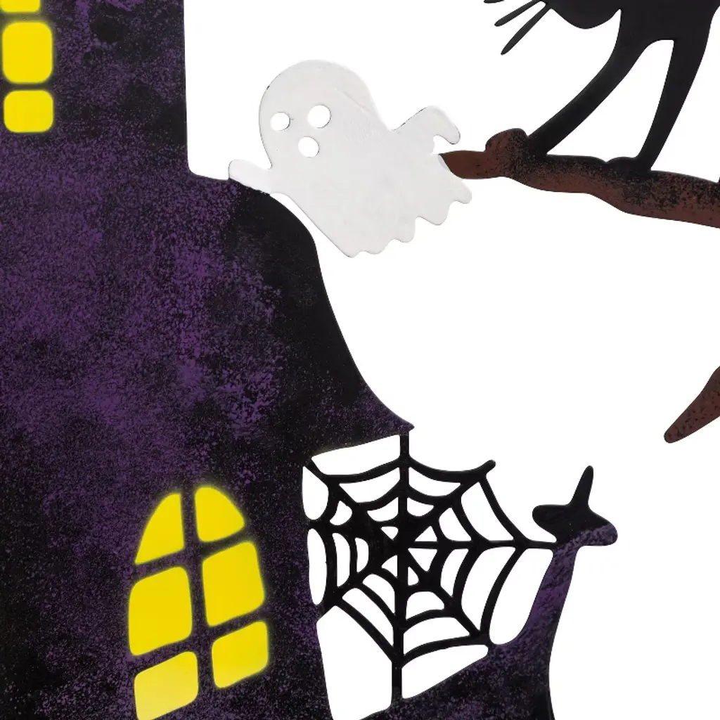 Create a creepy scene instantly with our metal Halloween Trellises. Each has laser-cut details to die for, painted in black with pops of yellow and orange. Witches trellis features two witches stirring a cauldron, while an owl and black cat look down at them from gnarled branches. Bats fly near the crescent moon. Haunted House features a run-down, spider webbed mansion with a ghost peering from the window, while a black cat and bats look on. This frightfully fun accent greets neighbors and trick-or-treaters and is effortless to display. Just drive the stakes into the ground for a dreadfully delightful display.