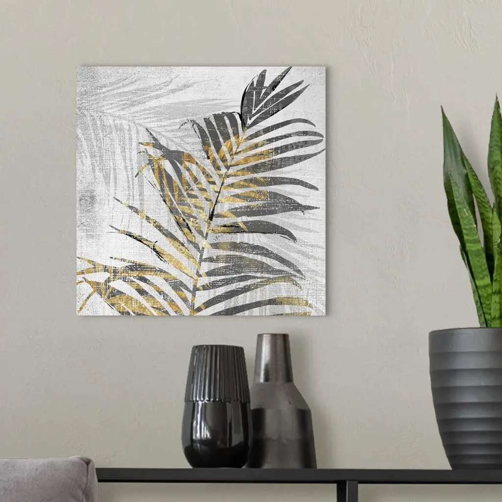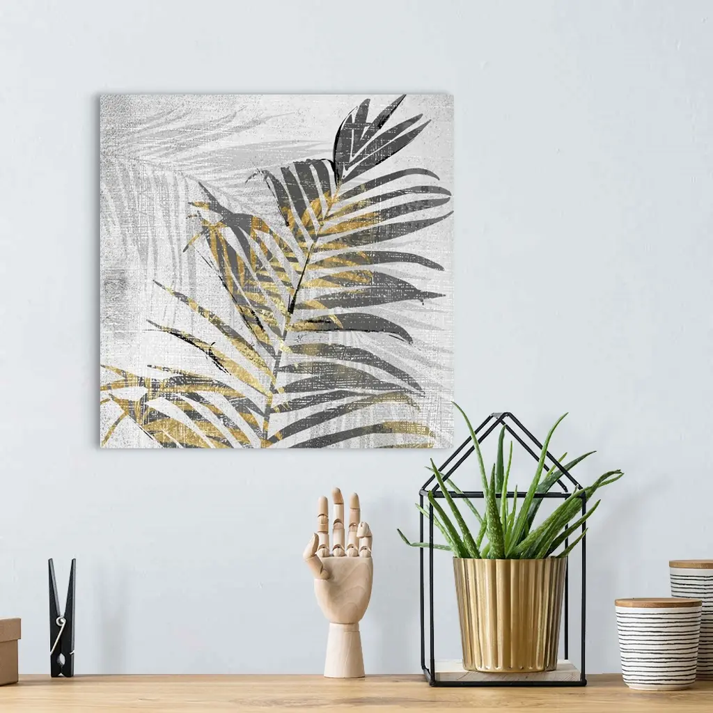 A square artistic image of a gold and gray fern leaves with a fade leaf in the background with white scratches on top.