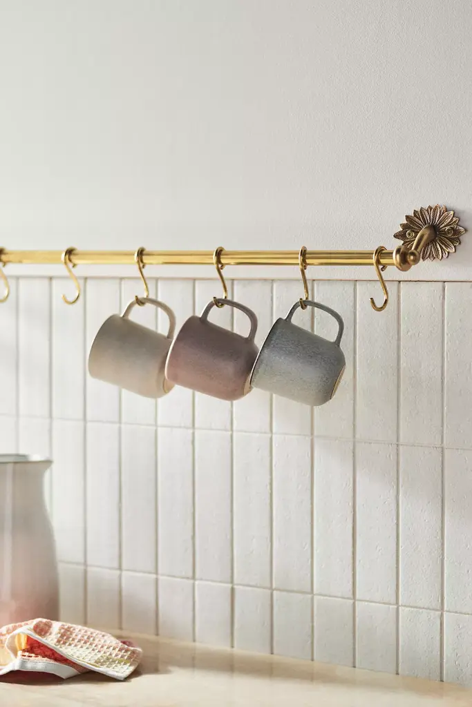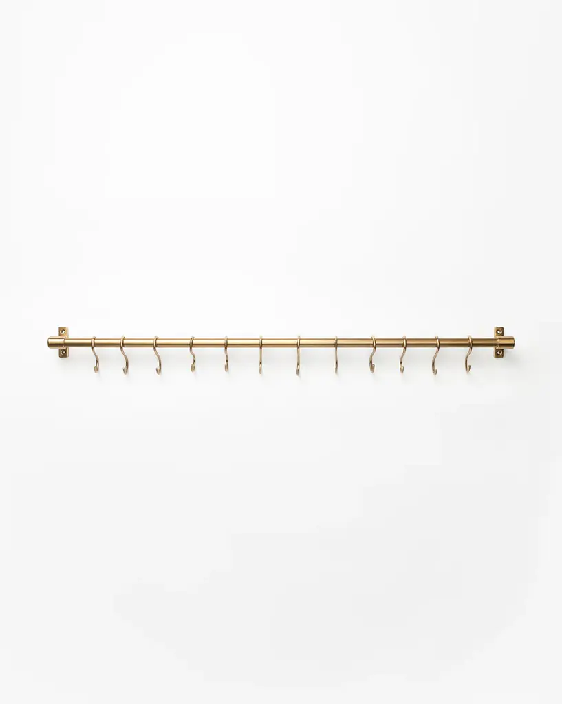Crafted from iron in a brass finish, the Metal Pot Rack Bar adds a vintage-inspired aesthetic to the kitchen. With hooks that can support small pans or kitchen essentials, this piece brings a touch of warmth to the space.