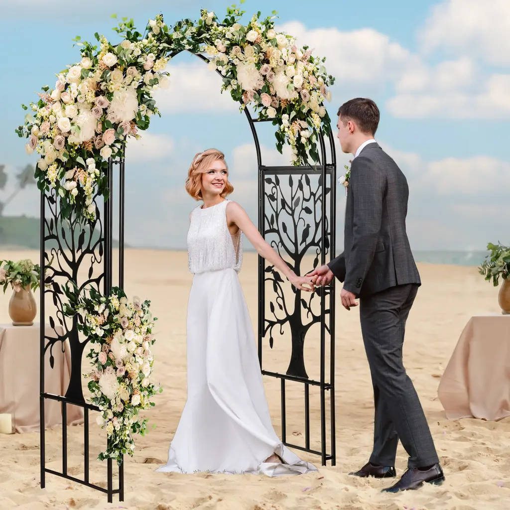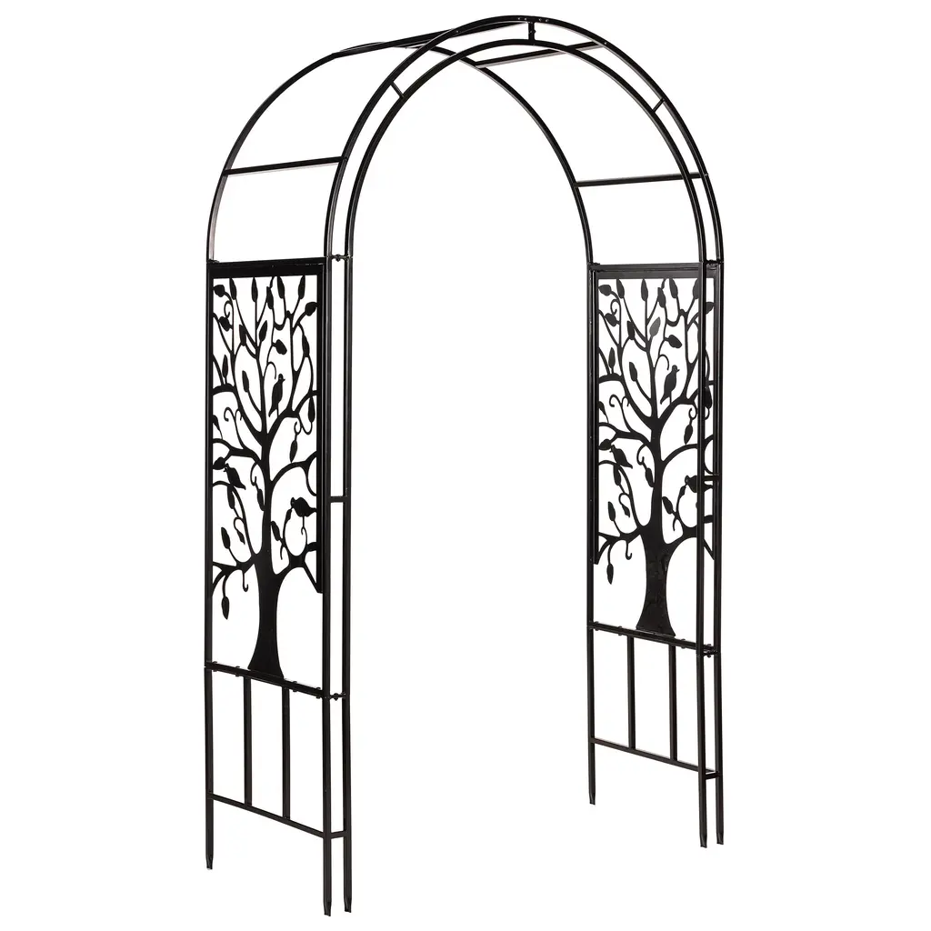 Our laser-cut Tree of Life Arbor will bring out the natural beauty within your yard or garden. Whether supporting flowering vines and climbing plants, or left naturally unadorned, you'll love the look it adds to your landscape. It's beautiful covered in wisteria, roses, clematis, bougainvillea and more.No matter what you believe, the Tree of Life is a symbol known to most of humankind, representing the interconnection of all living things. The graceful branches lift upward, reaching for the sky and calling to mind the complexity of life and the unending nature of the afterworld. The tree is firmly rooted in the ground which gives it life, thereby connecting the heavens and Earth. Birds are often associated with freedom and eternal life, bringing even more meaning to the design.Our Tree Of Life Arbor creates a grand welcome into a yard or garden with a wide, arched opening and detailed, leafy design. Its presence will bring a sense of peace to any space it occupies. Let this Arbor provide a daily reminder of what's really important - stop to ponder its beauty each day and enjoy a brighter outlook. This Arbor would make the perfect accent for a wedding or other outdoor celebration.Made from lightweight, sturdy tubular steel, our Tree of Life Arbor will grace your landscape for years to come. The laser-cut Tree of Life inset features a burnished bronze finish that glimmers in the sunlight, while the frame and arbor arch elements finished with a black powder coat. Built-in ground stakes offer stability and semi-permanent installation. Easy assembly required; all hardware and instructions included.