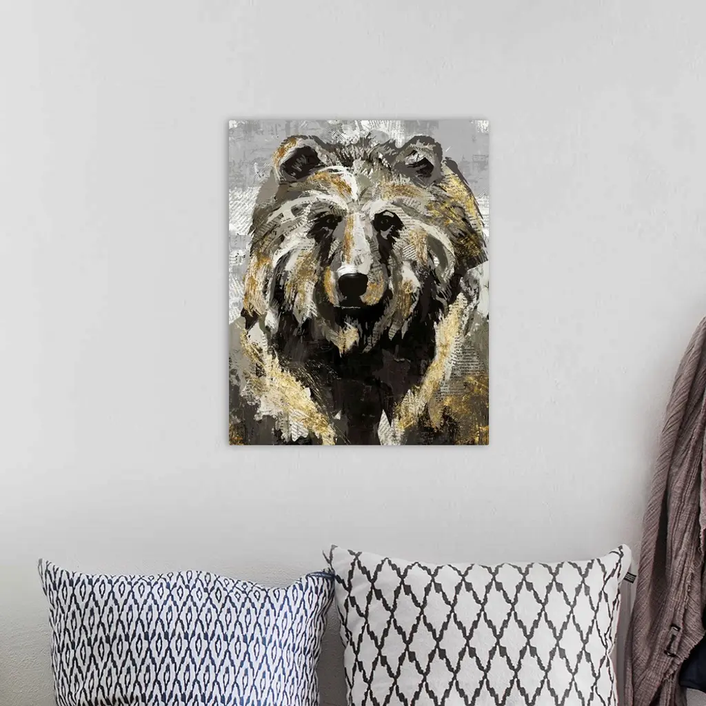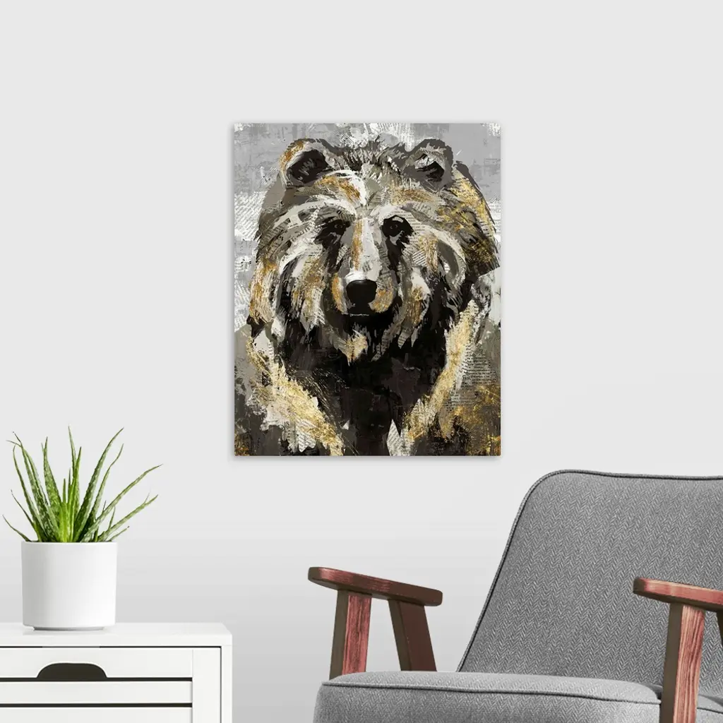 A decorative image of a bear with gold accents on a gray backdrop with faded newspaper peeping throughout.