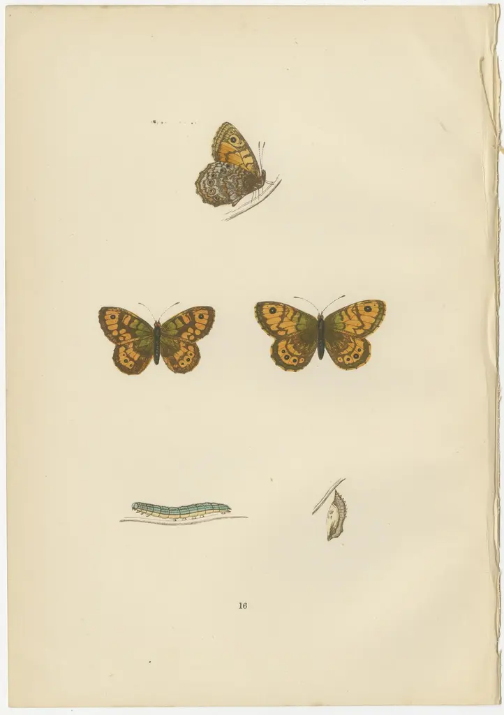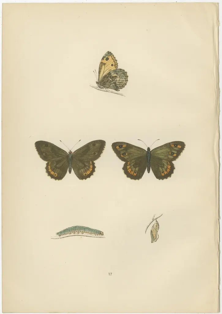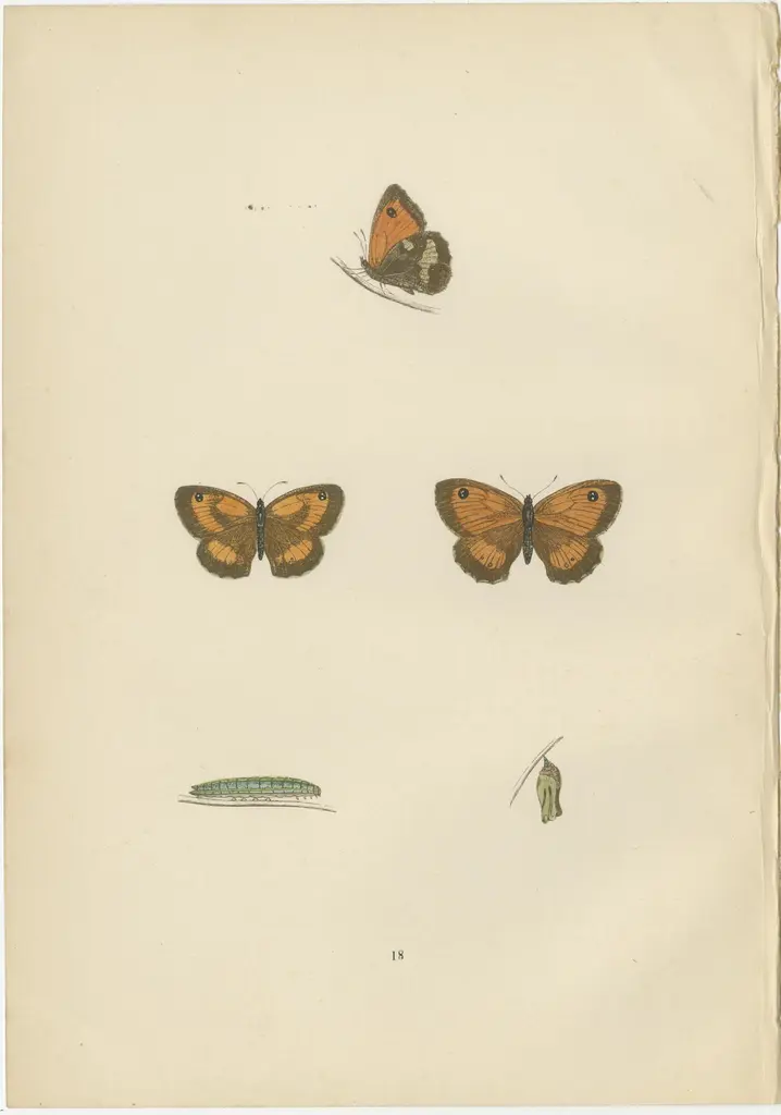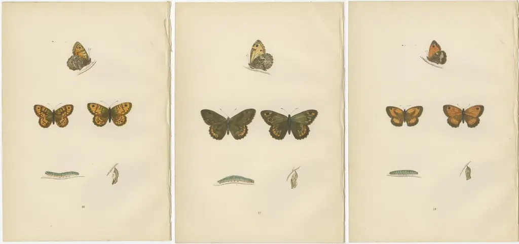 The butterflies depicted in the images represent species from the British Isles, from 'A History of British Butterflies' by Morris. They are original hand-coloured antique prints. Here's some information about each species:1. Gatekeeper (Pyronia tithonus): Often found in hedgerows and grassy fields, the Gatekeeper or Hedge Brown is a medium-sized butterfly with warm brown colors and eyespots on the tips of the wings, which are believed to deflect attacks from predators away from the more vital body parts. Males have a distinctive sex brand on their forewings, which are patches of specialized scent scales used to attract females.2. Grayling (Hipparchia semele), often mistaken for the Rock-Eyed Underwing: This butterfly has cryptic coloring that offers excellent camouflage against rocks and tree bark, enabling it to go unnoticed when its wings are closed. It is a species that enjoys basking with its wings flat against a sunny surface. The underwings are mottled with grays and browns, resembling the textures of rocks and tree bark, which is an effective adaptation for evading predators.3. Meadow Brown (Maniola jurtina), likely what is referred to as the Small Meadow Brown: This is one of the most common and widespread butterflies in Britain. The females are usually slightly paler and have more orange on the wings, while the males have a dark patch of scent scales on their forewings. The Meadow Brown is adaptable and can thrive in a variety of grassy habitats.What makes these species interesting, apart from their beauty and contribution to biodiversity, is their adaptability to the British climate and their roles as pollinators in their ecosystems. Each butterfly has developed unique adaptations, from the Gatekeeper’s mating strategies to the Grayling’s camouflage and the Meadow Brown’s widespread presence across varying habitats, showcasing the diversity of survival strategies in the butterfly world. These characteristics, coupled with their intricate life cycles depicted in the stages of caterpillar to chrysalis to adult butterfly, make them a fascinating subject for both nature enthusiasts and scientists.