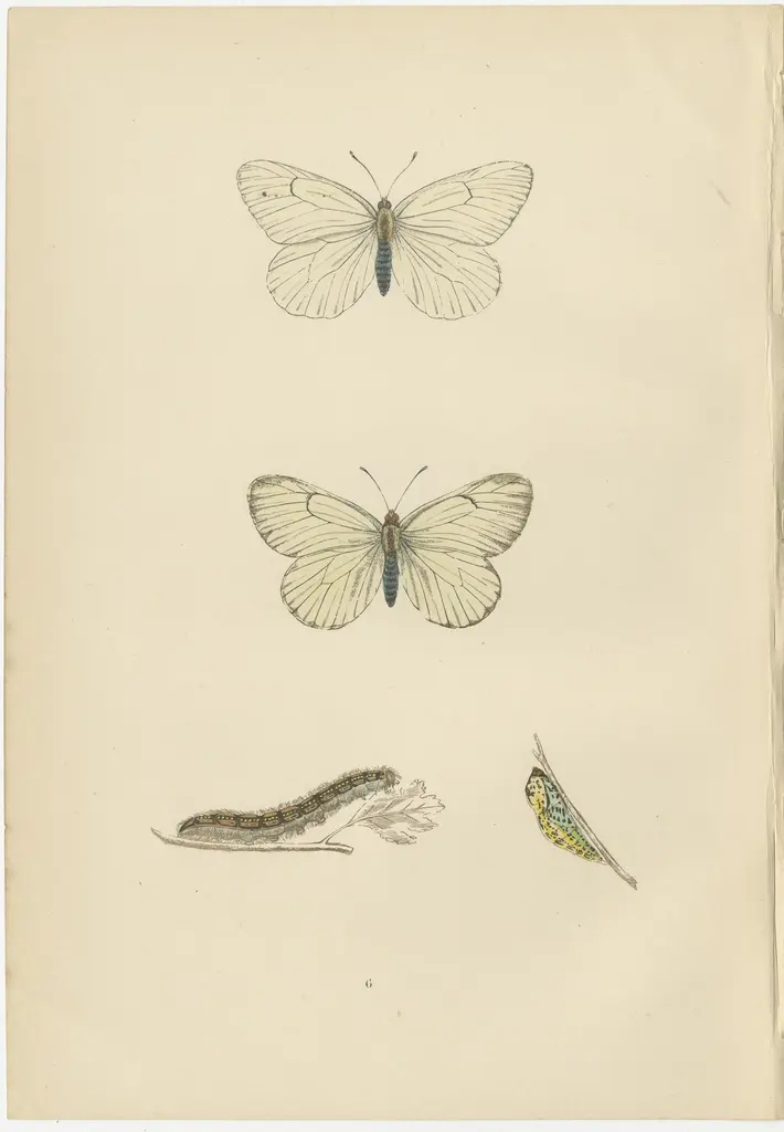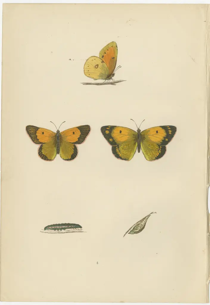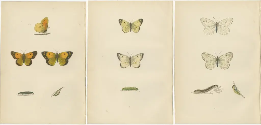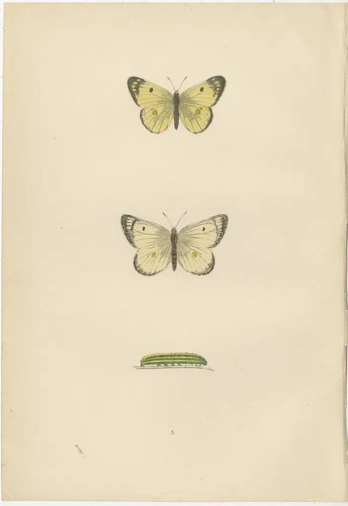 The images are hand-colored plates from "A History of British Butterflies" by Morris, showcasing three distinct butterfly species: the Clouded Yellow, the Pale Clouded Yellow, and the Black-veined White.1. Clouded Yellow (Colias croceus): This butterfly is easily recognizable by its bright yellow wings with solid black borders. Males typically have a sharper yellow color, while females may be paler with more extensive black borders. They are migrants to Britain and can be seen in a variety of habitats, including chalk grasslands and clover fields. Their striking color is not just for show; it plays a role in thermoregulation and mate attraction.2. Pale Clouded Yellow (Colias hyale): Closely related to the Clouded Yellow, the Pale Clouded Yellow has lighter, lemon-yellow wings with narrower black borders. This species is less common and is also a migrant, arriving in varying numbers each year. These butterflies are interesting because their appearance in Britain can be quite unpredictable, with some years seeing large influxes, known as 'Clouded Yellow years'.3. Black-veined White (Aporia crataegi): As the name suggests, this butterfly's wings are predominantly white with pronounced black veins running throughout. Unlike the other two, this species was once widespread in Britain but sadly became extinct around the early 20th century, primarily due to changes in woodland management that reduced the availability of its larval food plants. Their presence on these plates serves as a historical record of the biodiversity that was once found in the UK.What makes these butterflies particularly interesting is their varied migration patterns and their adaptations to their environments. The Clouded Yellows are noted for their sometimes vast migrations, which can lead to large populations appearing in the UK in some years. The Black-veined White is of particular historical and ecological interest because it represents a lost species within the UK butterfly fauna, highlighting the importance of habitat conservation. Each butterfly's unique coloration and patterns also have specific evolutionary functions, such as attracting mates, camouflaging from predators, or warning of their unpalatability.