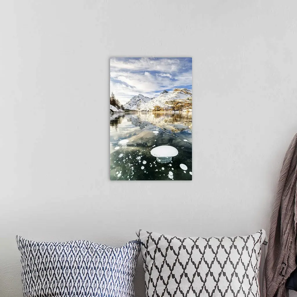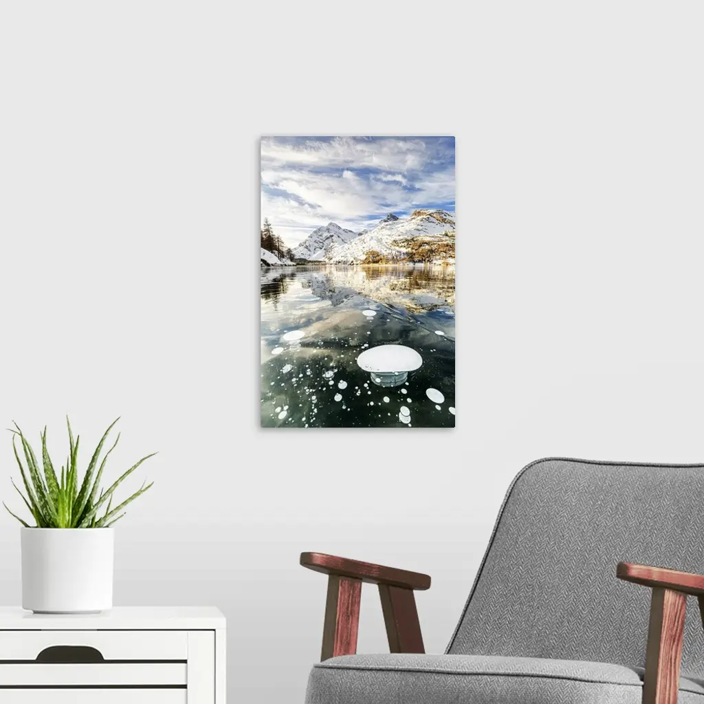 Methane bubbles in the icy surface of Silsersee with snowy peak, Lake Sils, Engadine Valley, Graubunden, Swiss Alps, Switzerland, Europe