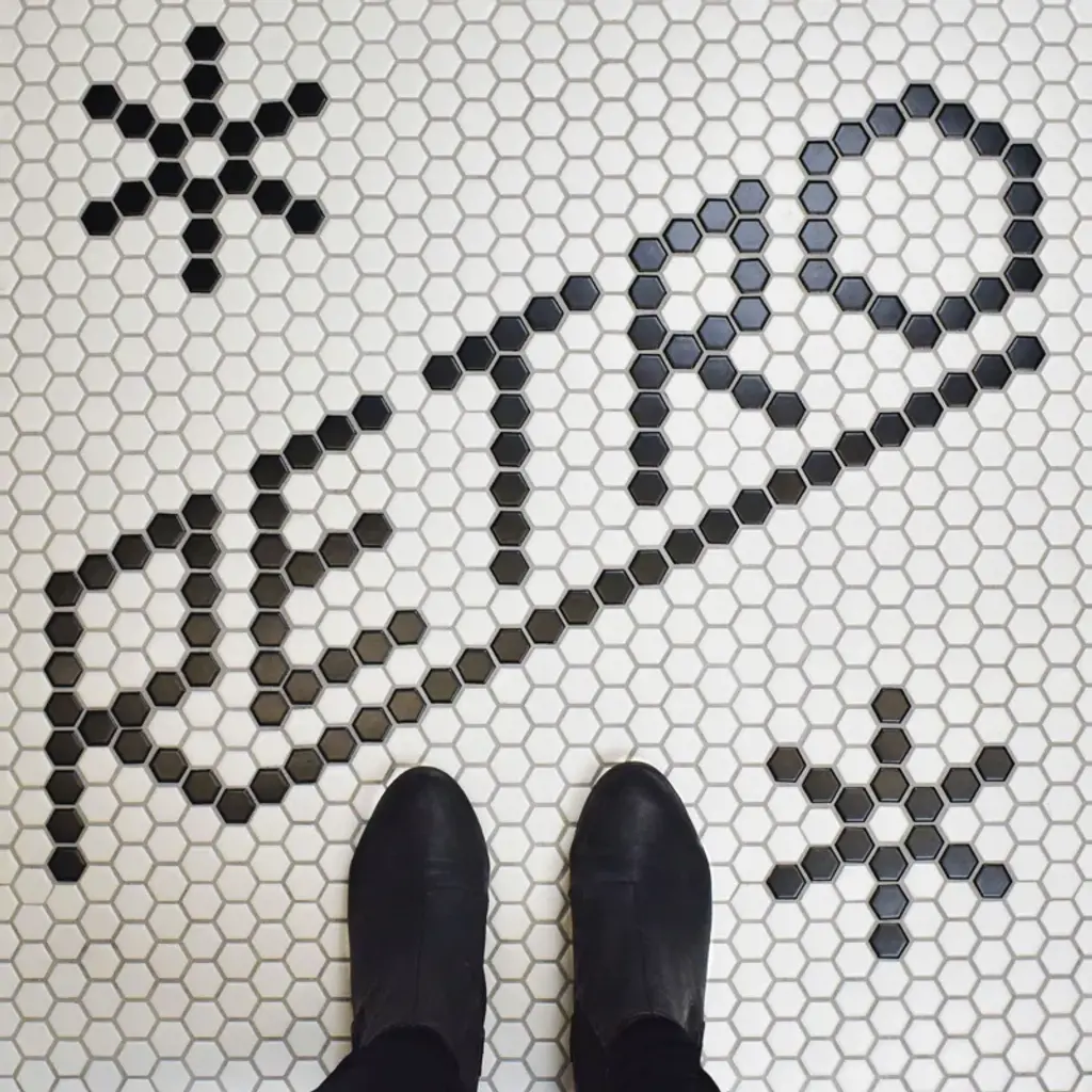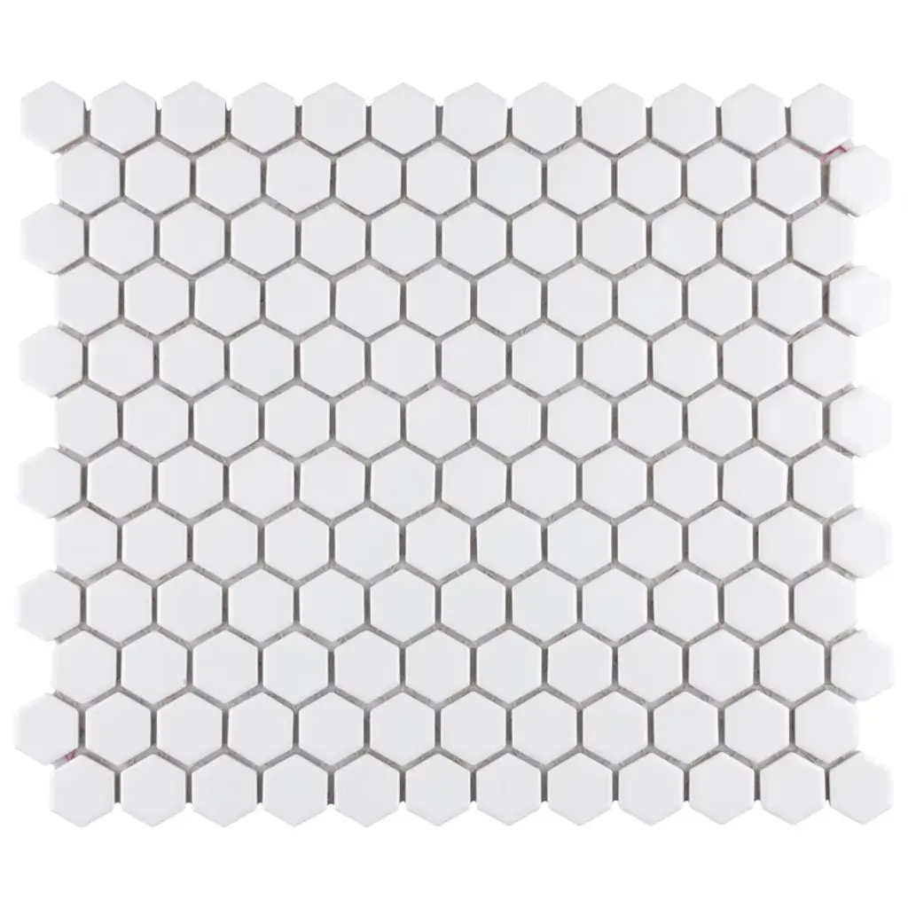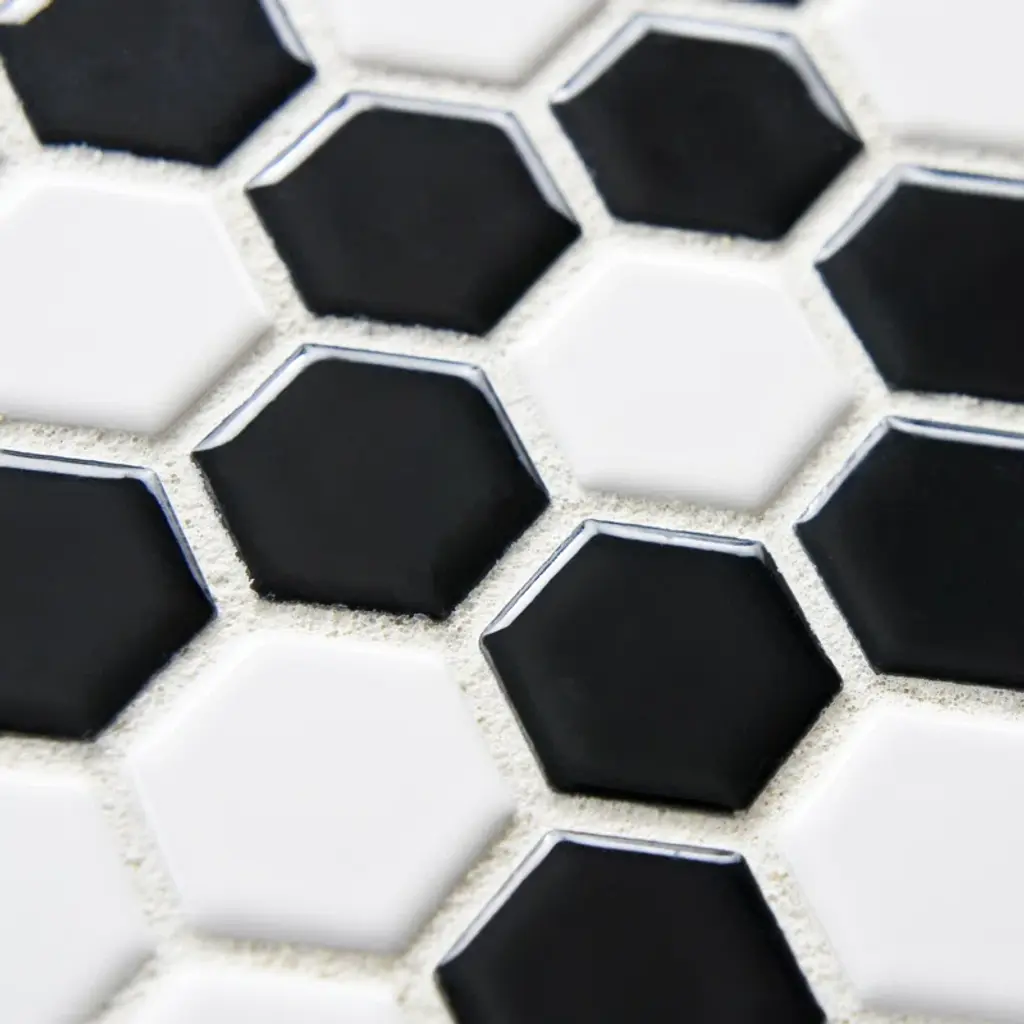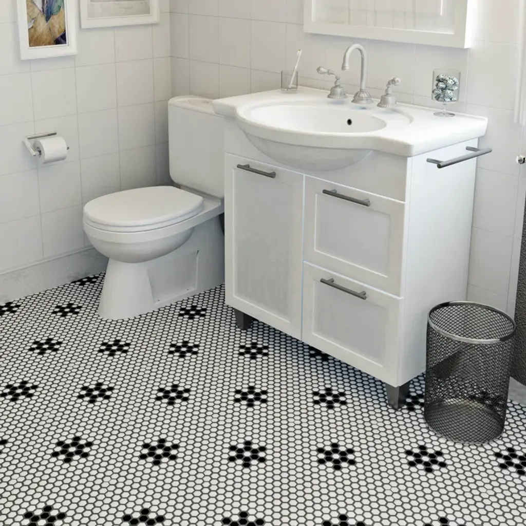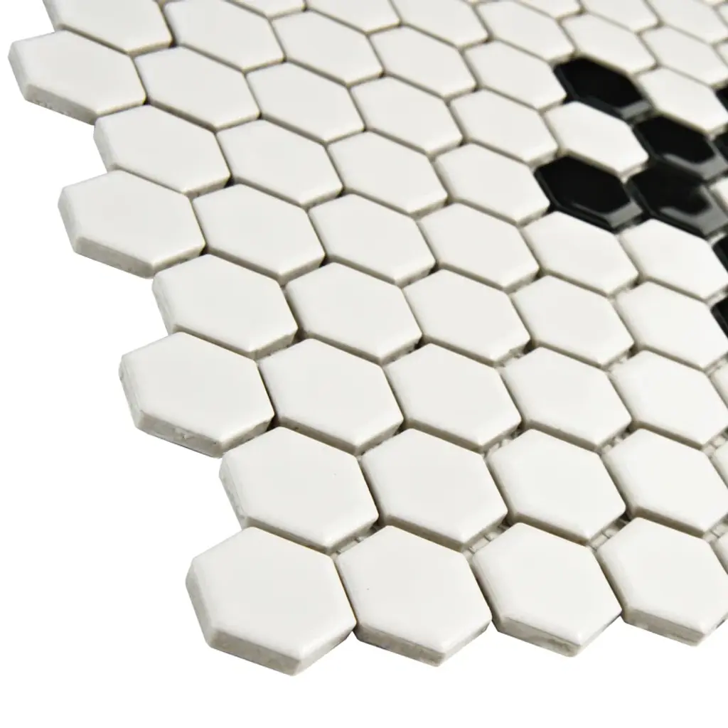 Transform your space into a tribute to retro design with our Metro Hex 1” Glossy White Snowflake 10-1/4” x 11-7/8” Porcelain Floor and Wall Mosaic Tile. As a modern deviation from the classic mosaic, this fresh option is a throwback to traditional retro design with a contemporary feel. Glossy white hexagons are accented by contrasting glossy black hexagons arranged into a snowflake shape on an interlocking mesh to create a seamless installation. This minimalistic geometric porcelain mosaic is unique yet simplistic enough to integrate into any design, ranging from traditional style renovations to modern home projects. Its impervious and frost-resistant features make this an ideal tile for both indoor and outdoor residential use, including backsplashes, bathrooms, showers, kitchens and fireplace facades. This tile is a perfect choice on its own or paired with other products in the Metro Collection. Tile is the better choice for your space. This tile is made from natural ingredients, making it a healthy choice as it is free from allergens, VOCs, formaldehyde and PVC.