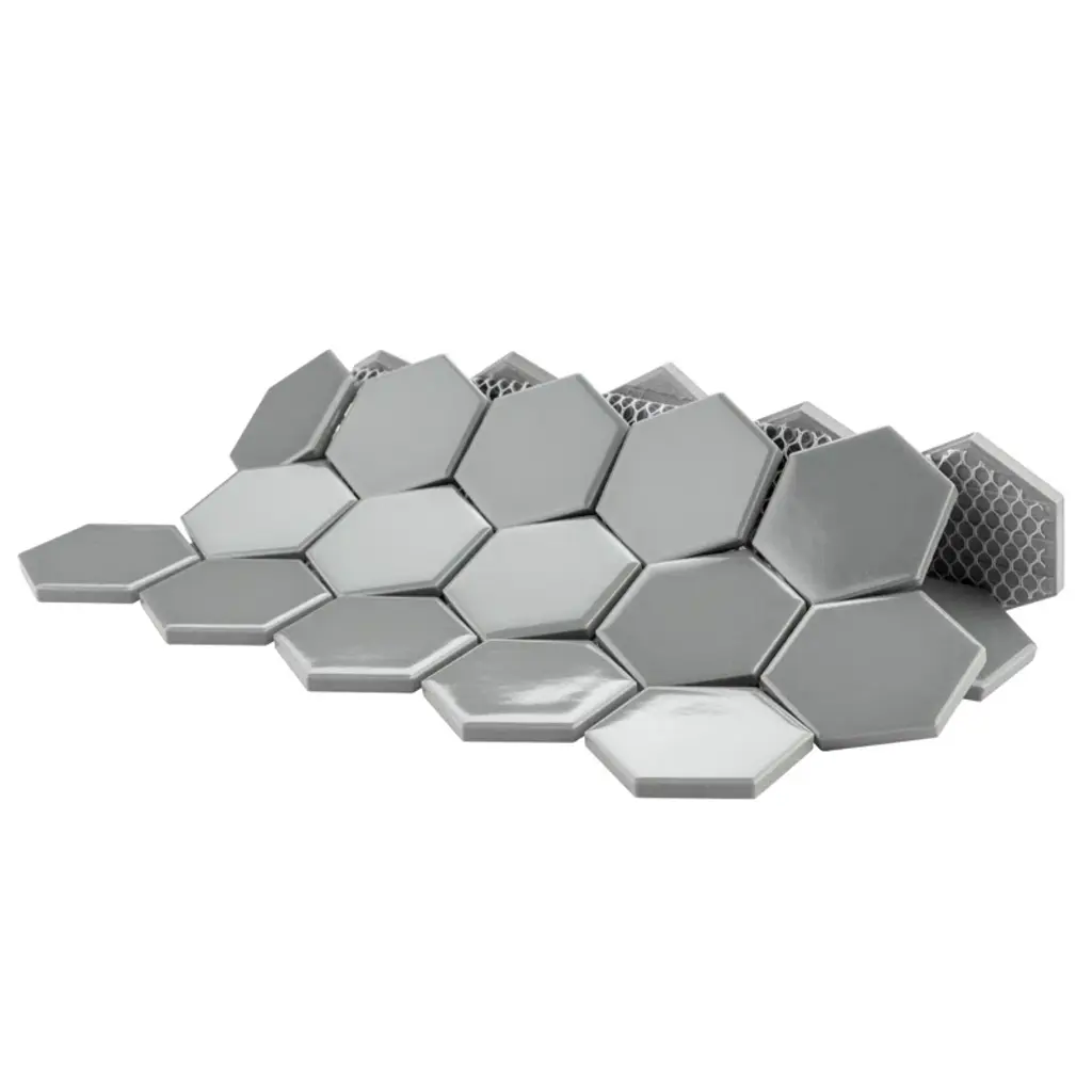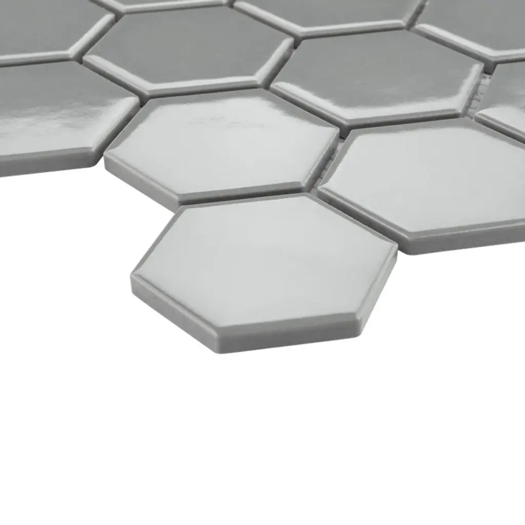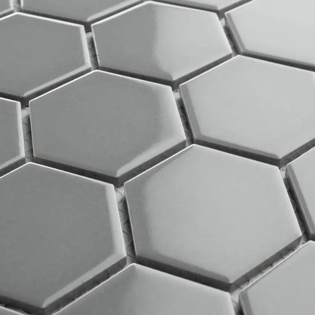 Transform your space into a tribute to retro design with our porcelain mosaic. As a modern, enlarged deviation from the classic hexagon mosaic, this fresh option is a throwback to traditional retro design with a contemporary feel. Glossy grey hexagons are precisely arranged on an interlocking mesh to create a seamless installation. This minimalistic geometric porcelain mosaic is unique yet simplistic enough to integrate into any design, ranging from traditional style renovations to modern home projects. Its impervious, frost-resistant, and durable features make this an ideal tile for both residential indoor and outdoor use, including backsplashes, bathrooms, kitchens, and patios. Tile is the better choice for your space. This tile is made from natural ingredients, making it a healthy choice as it is free from allergens, VOCs, formaldehyde, and PVC.