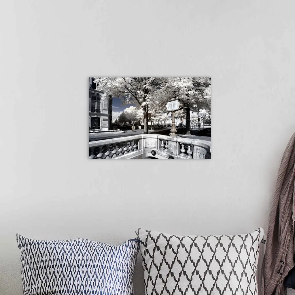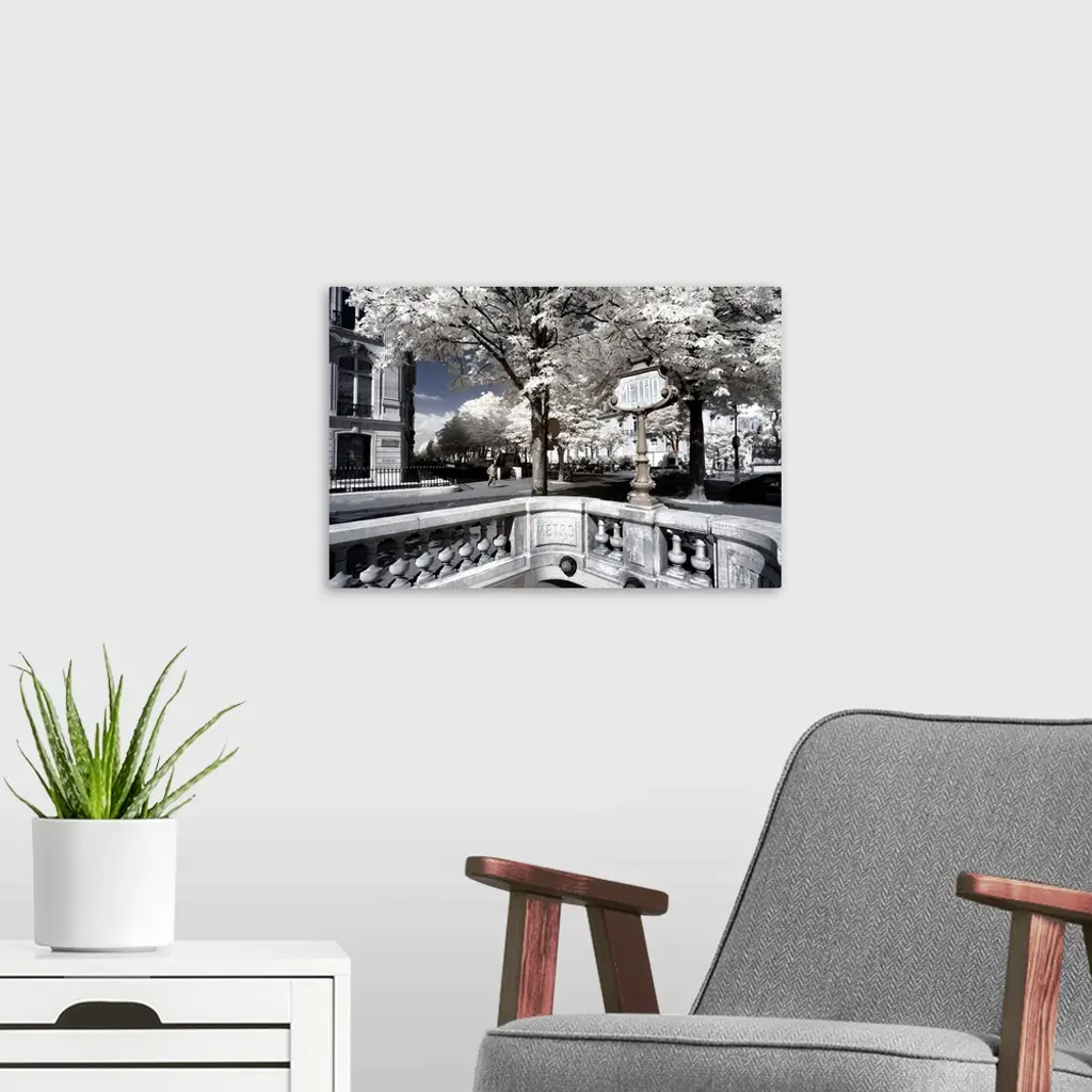 Sign for the Metro in a park in Paris, made in infrared mode in summer. The vegetation is white and rendering of the sky is deep blue. From the "Another Look" series.