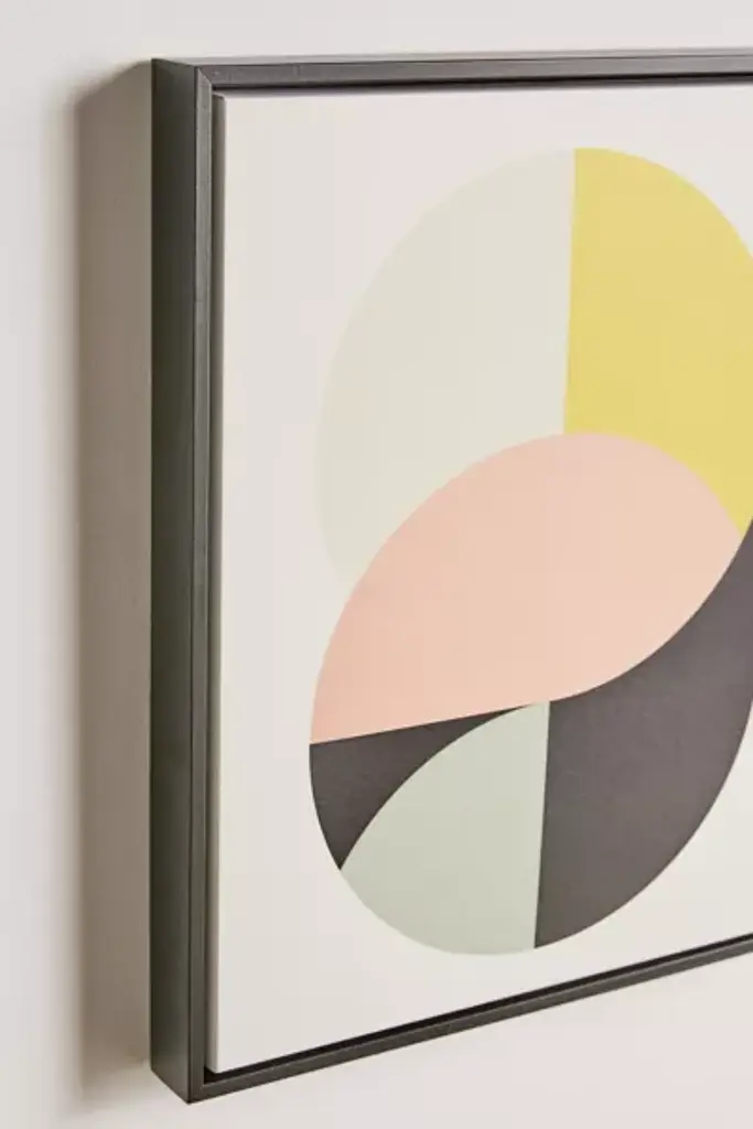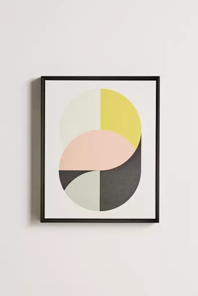 Swirled geometric graphic by Metron, featuring colorblocked panels. Printed on matte finish polyester/cotton canvas with UV-resistant inks and gallery-wrapped edges, this high-quality art print is available in sizes and frames just right for your space. First select your frame, then select your size. **About the Frames** \- All frames are manufactured in the USA \- Wood frames are solid poplar wood with a water-based stain \- Ready to hang with sawtooth hardware backing **Size** \- Available in multiple sizes **Content + Care** \- Polyester, cotton, poplar wood, metal \- Wipe clean \- Made in the USA