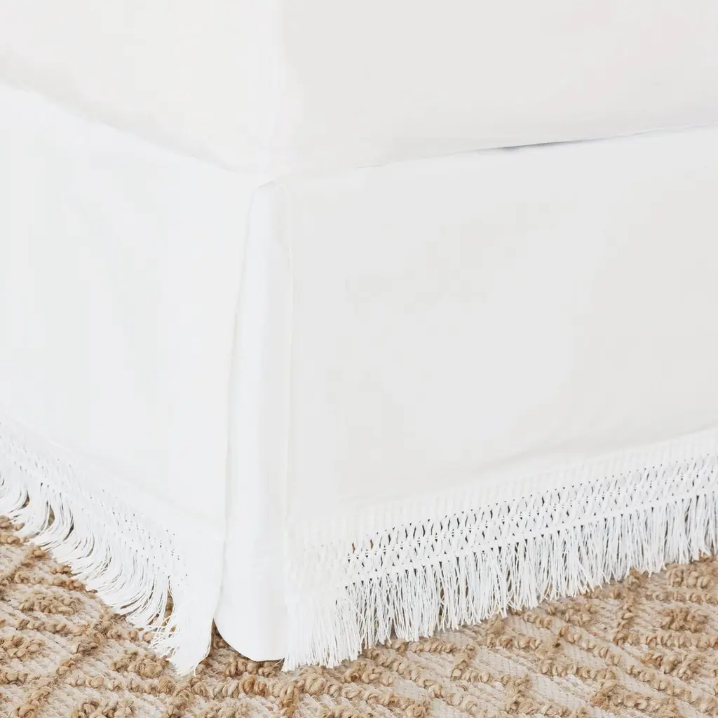 Fringe along the bottom of this snow-white cotton bed skirt brings a dash of boho chic to your bedroom. Fully lined, the bed skirt features split corners with kick pleats, a standard 16-inch drop, and a 3-inch decking border.