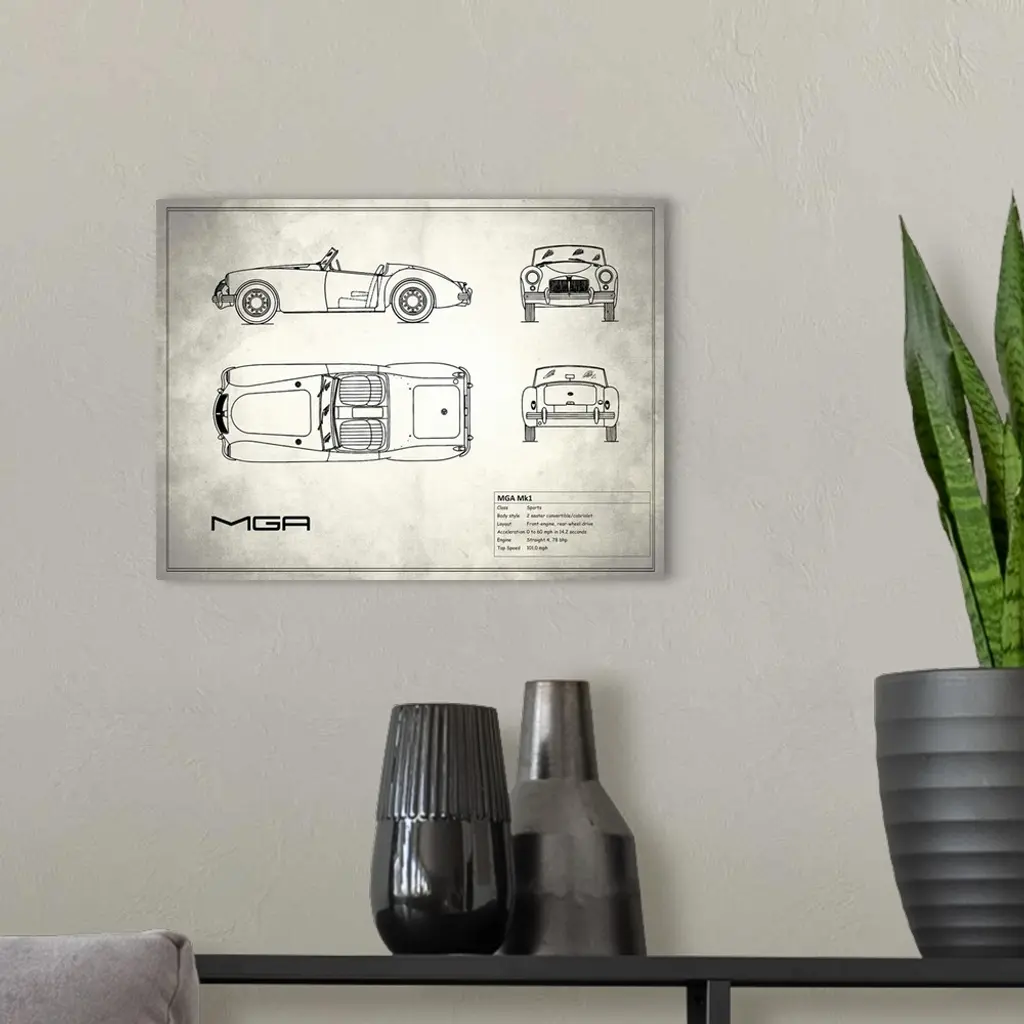 Antique style blueprint diagram of a MG MGA printed on a weathered white and gray background.