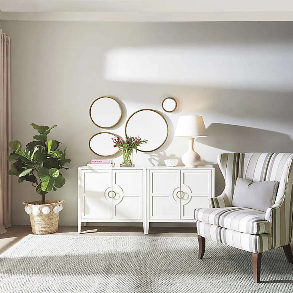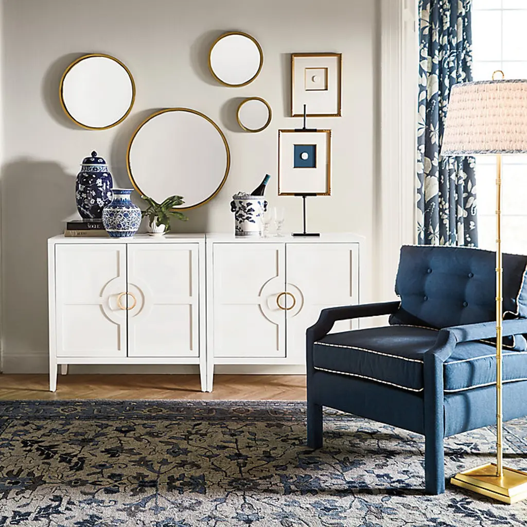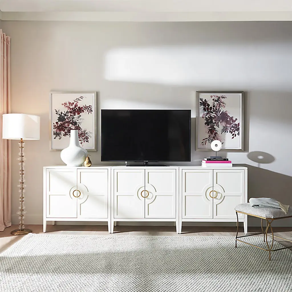 Hollywood Regency glamour for the dining room, media room or bedroom. Our Mia Console is beautifully crafted with inset panel doors designed to draw your eye to the satin brass half-moon pulls at its centers. Hidden European hinges preserve the elegant lines. Our Mia 4 or 6 door consoles are created by nestling two or three cabinets side-by-side creating a long sideboard, double console, or extended media cabinet. Mia Console features: