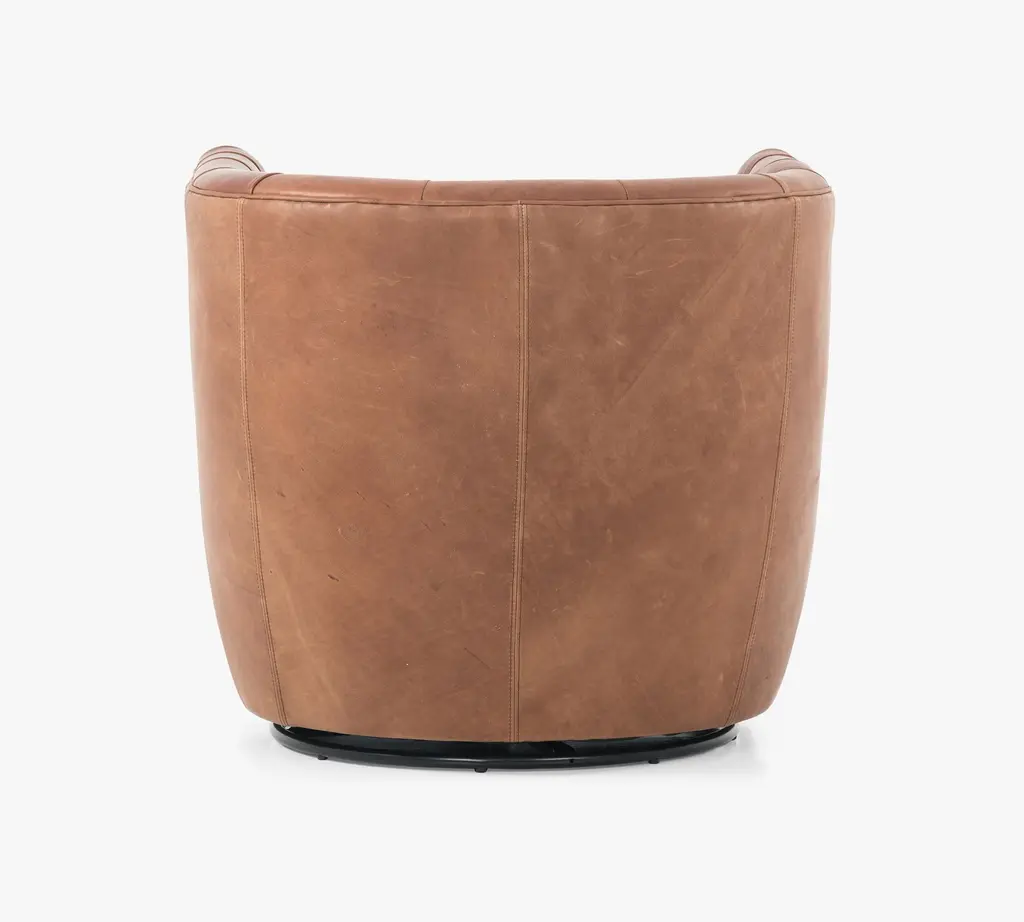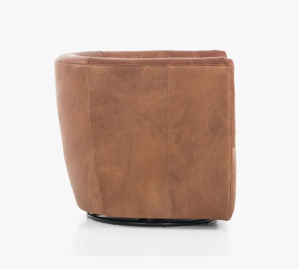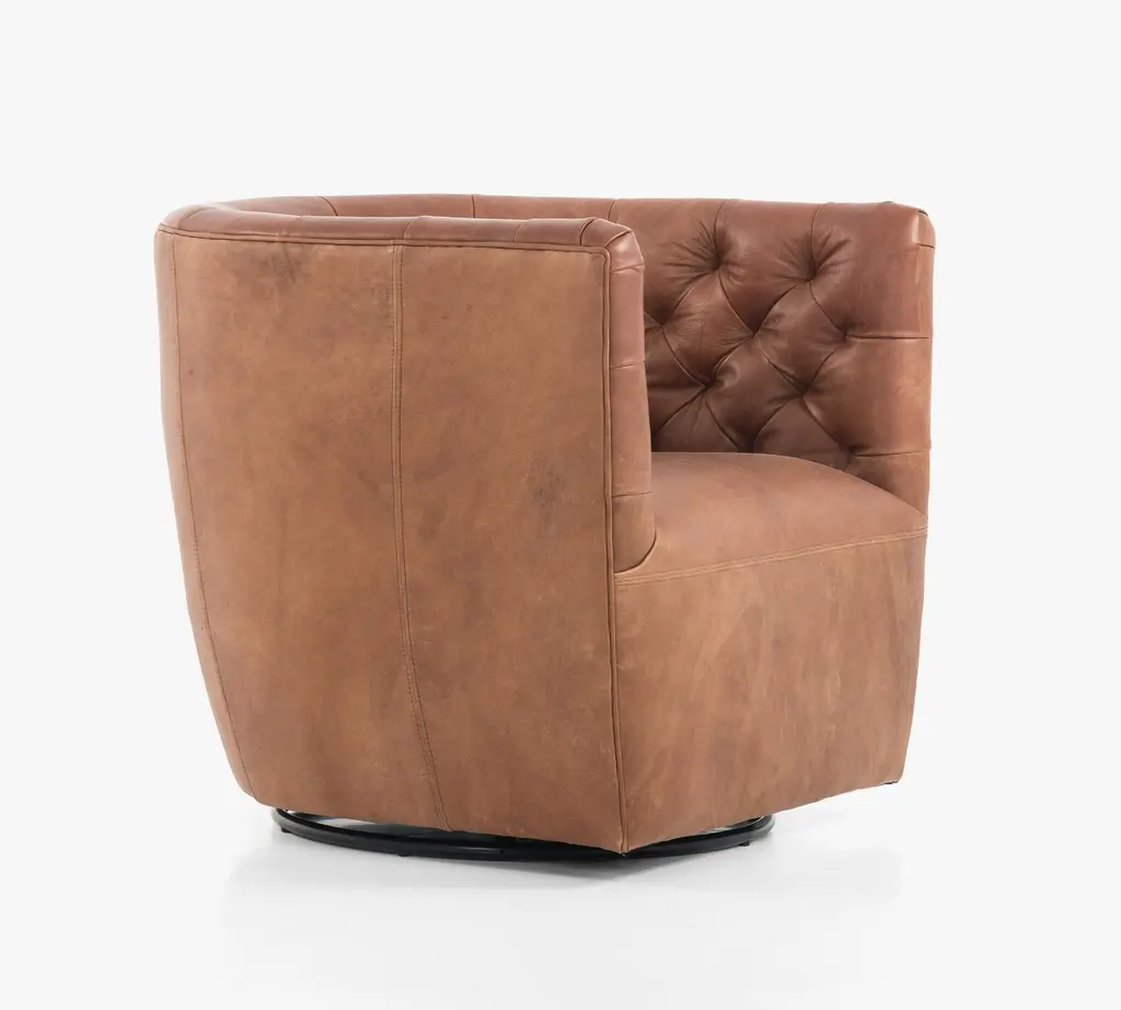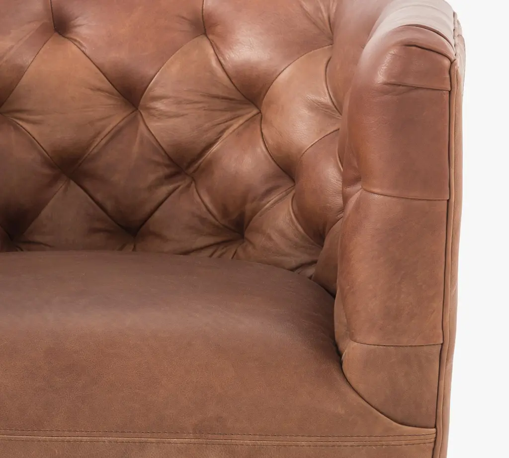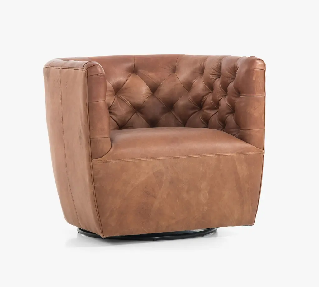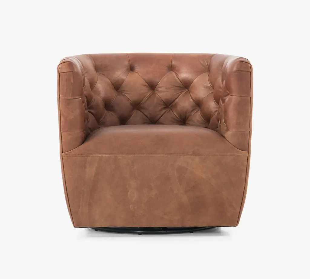Make a mid-century-inspired statement with our Mia armchair. The shapely silhouette recalls aerodynamic designs of the 1960s, its enveloping form flowing seamlessly from the curved back to high arms. Plush padding and tailored upholstery feature dramatic blind tufting for swanky flair, while a metal swivel base allows effortless 360-degree movement.