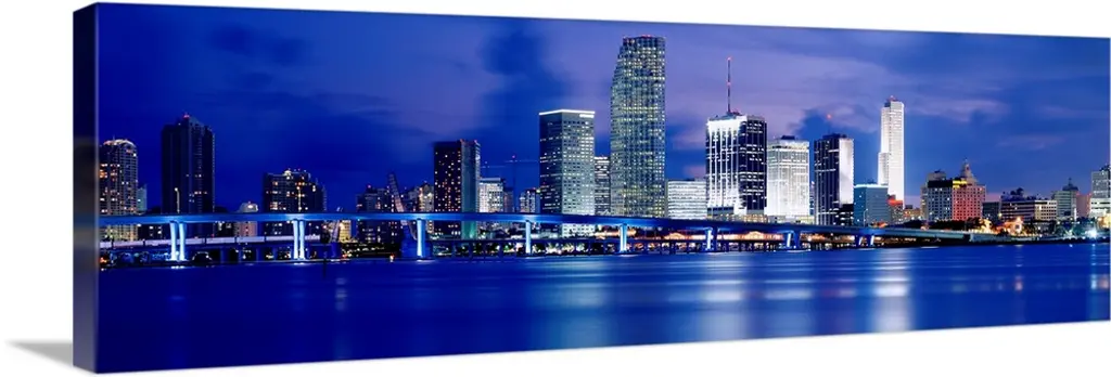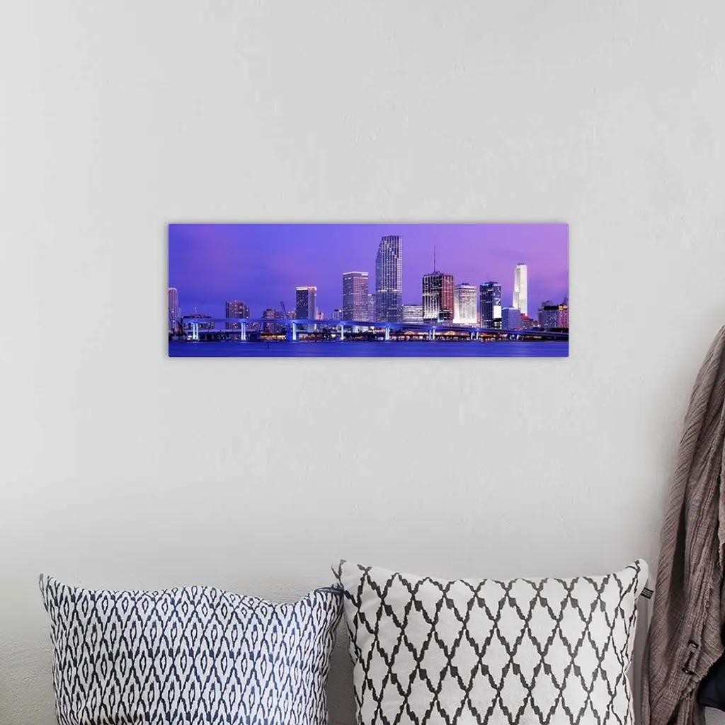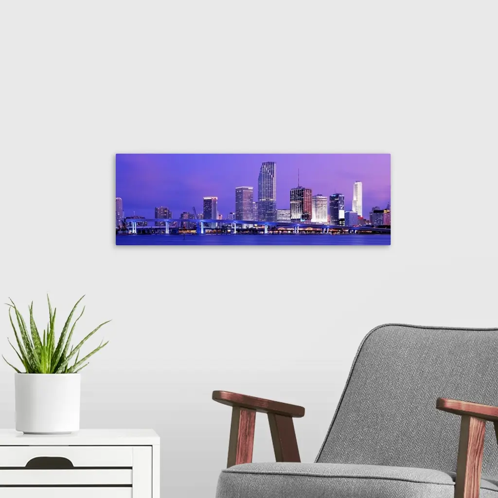 Wide angle photograph of brightly lit bridge and skyscrapers of the Miami skyline at sunset.