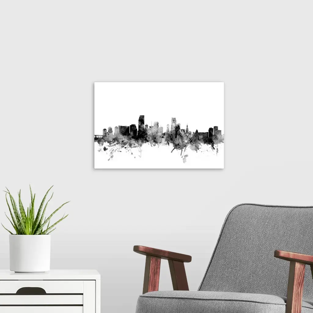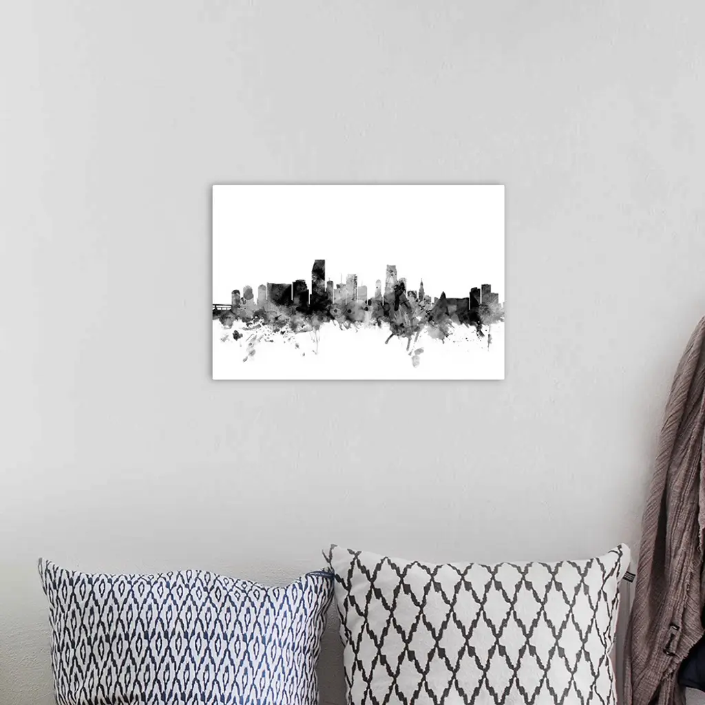 Smokey dark watercolor silhouette of the Miami city skyline.
