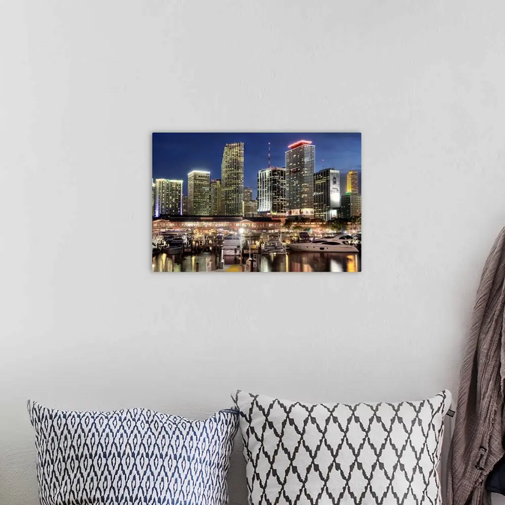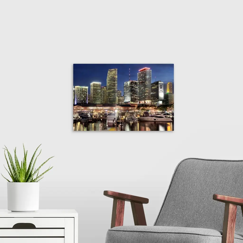 Photograph of the nighttime lit up Miami skyline down at the harbor with boats parked in their water slips.