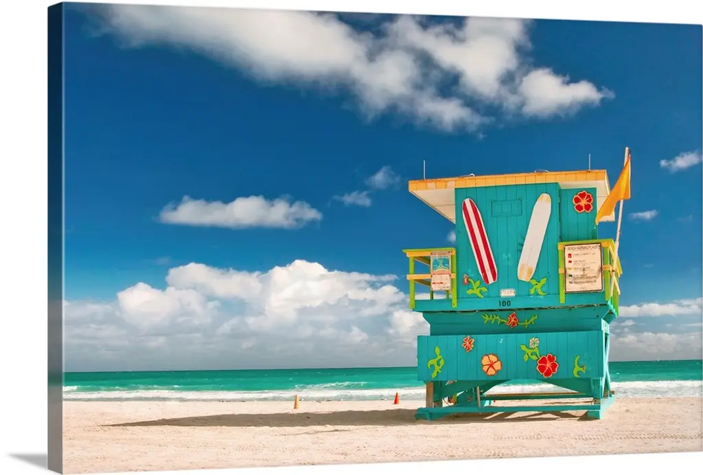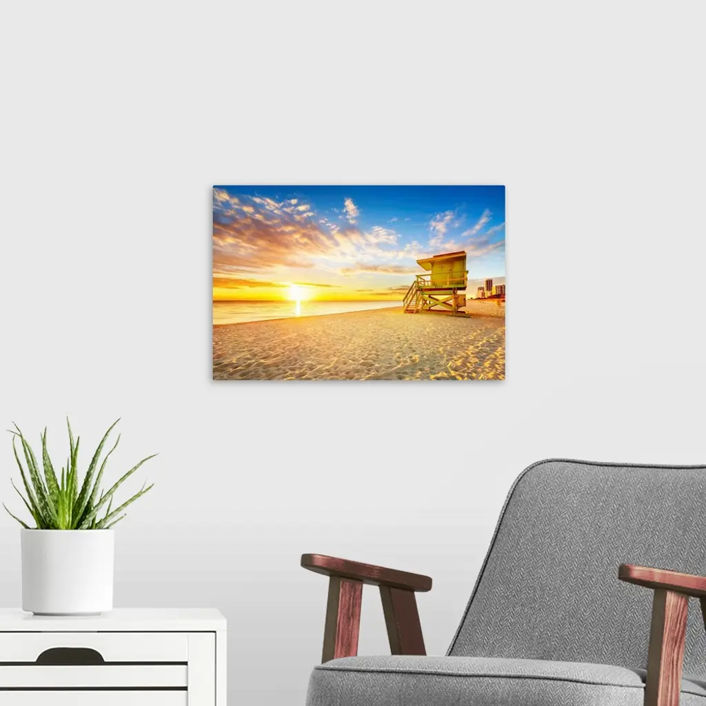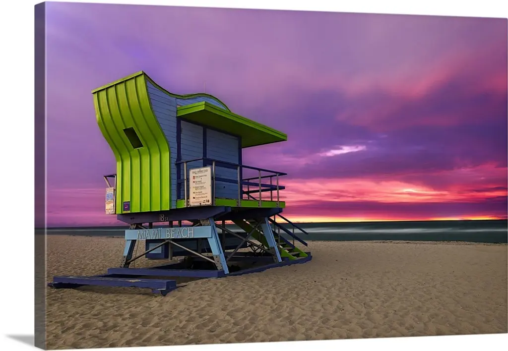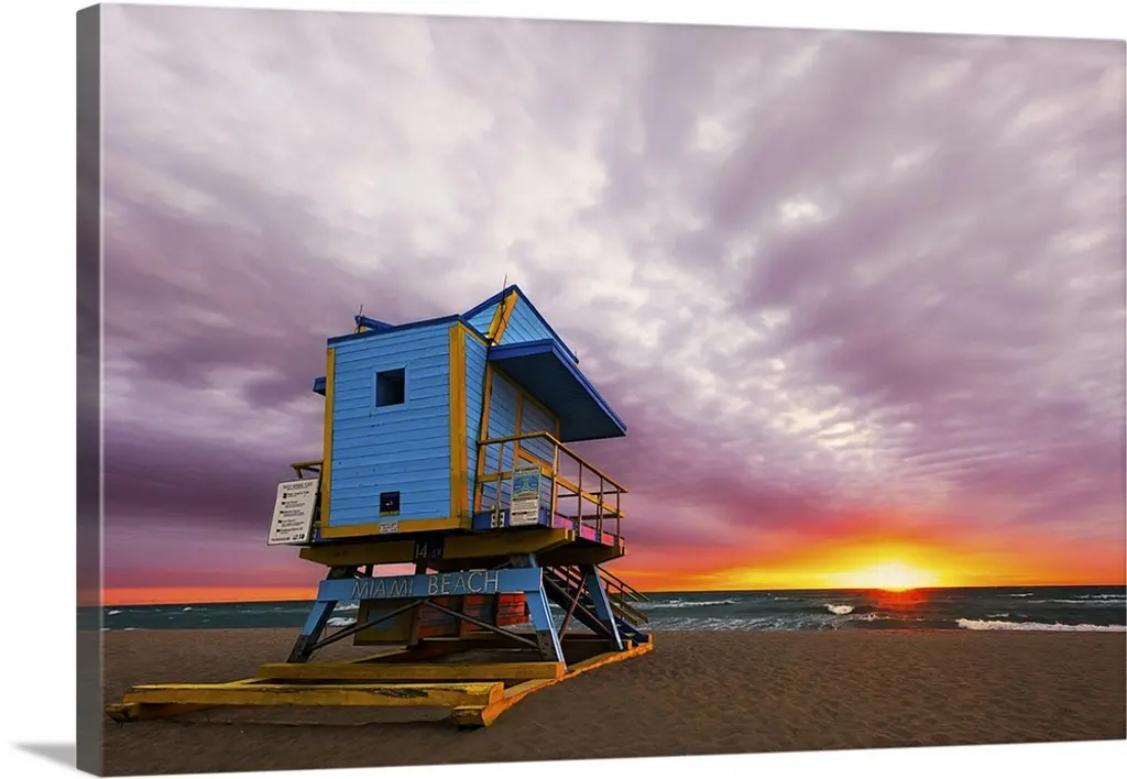 Miami South Beach sunrise with lifeguard tower and coastline.