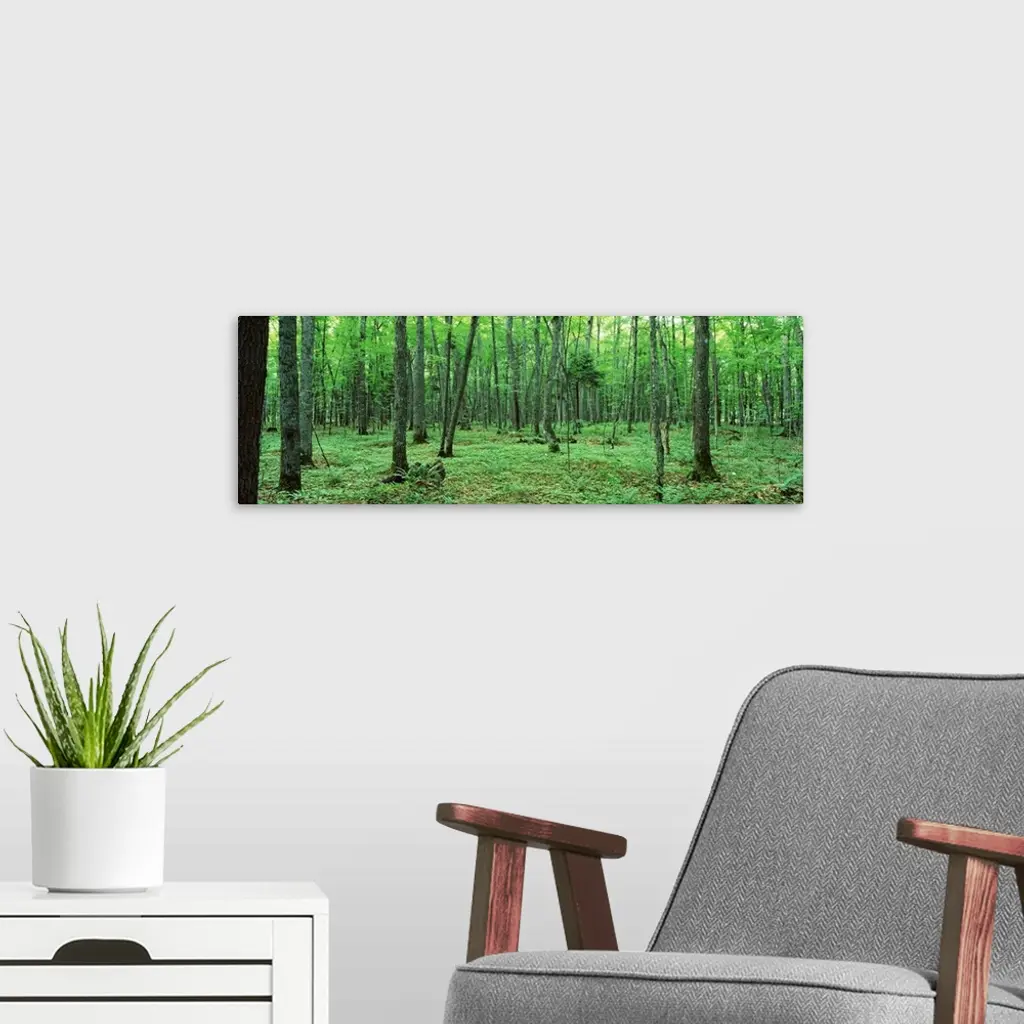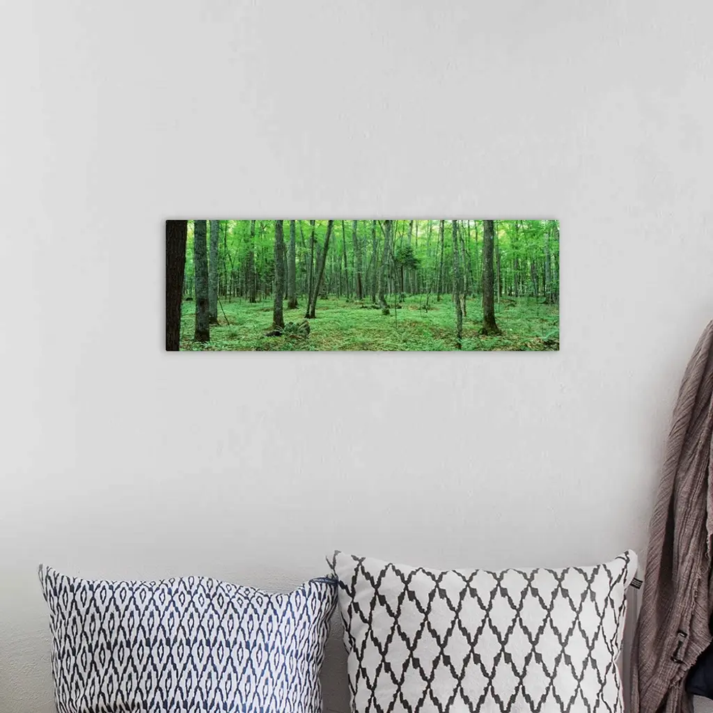 A dense forest is pictured in wide angle view. The ground is blanketed by thick foliage.