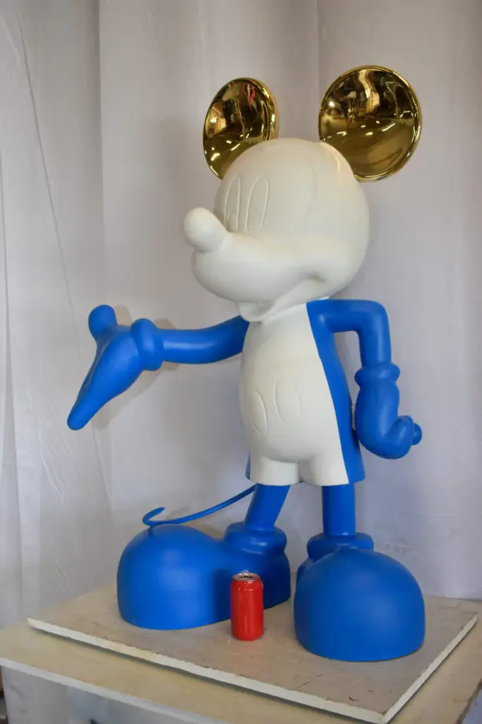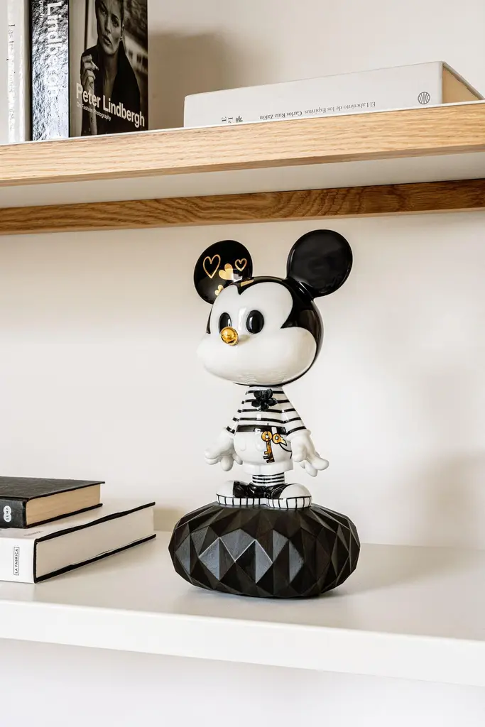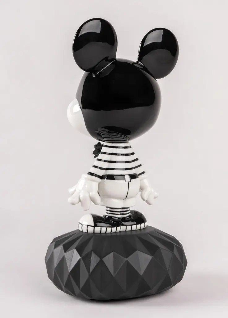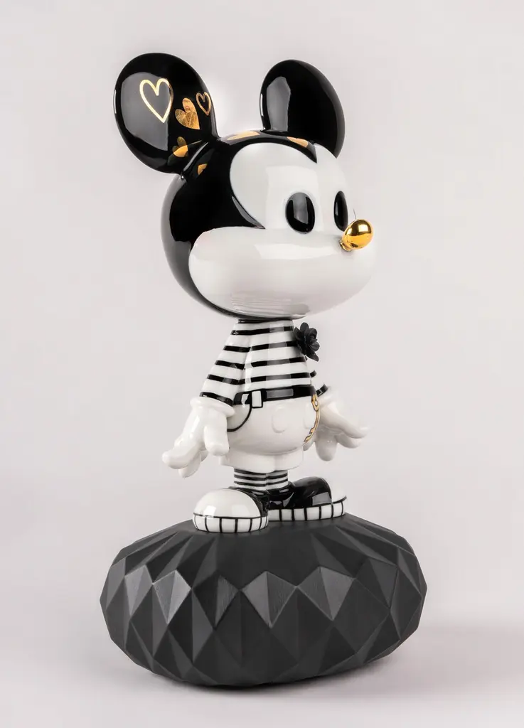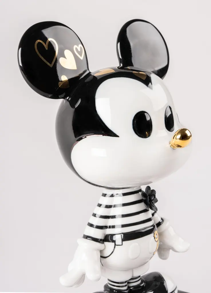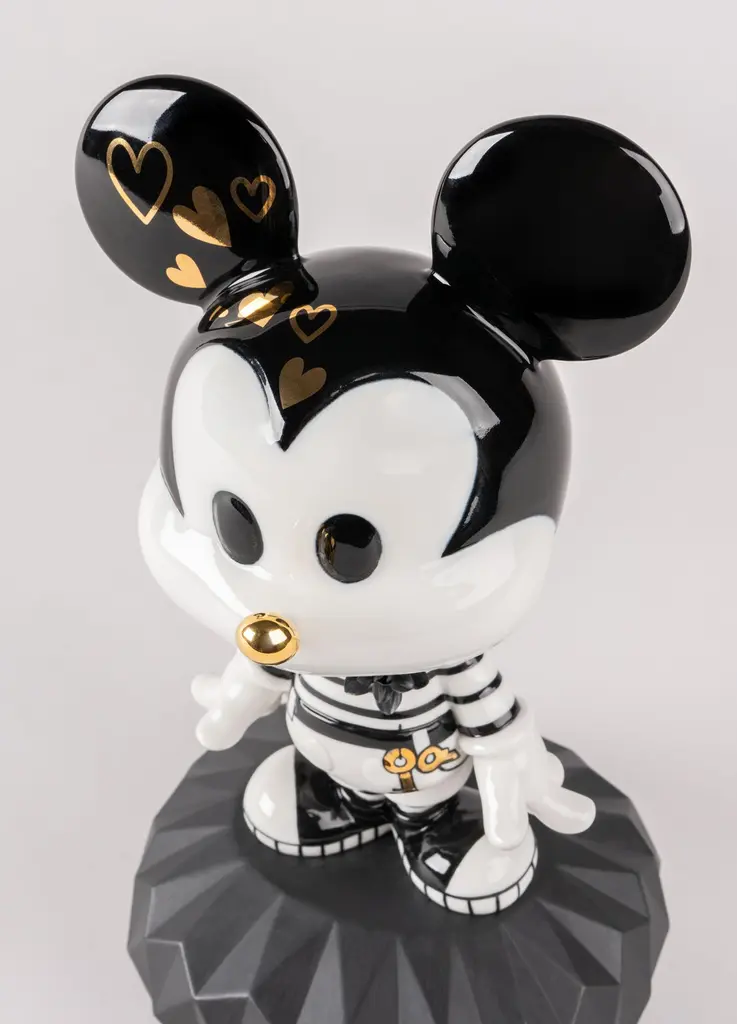 This creation is based on a contemporary vision of Mickey Mouse. The creative approach taken is based on the cartoon technique and contains black ink strokes on white. And so, Mickey is decorated with hand painted drawings on porcelain, symbolizing very prominent themes in Lladró's imaginary, such as love, nature and magic. The keys hanging above his waist are those with which Mickey opens all hearts. Because if there is a character that speaks of kindness and love, it is Mickey Mouse, especially in this proposal. Black and white gloss porcelain decorated with touches of gold luster. The base is made of matte black porcelain.