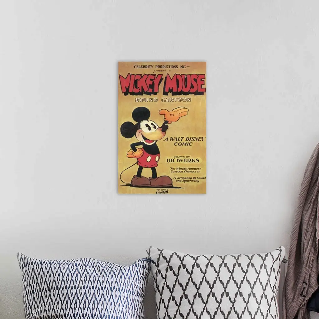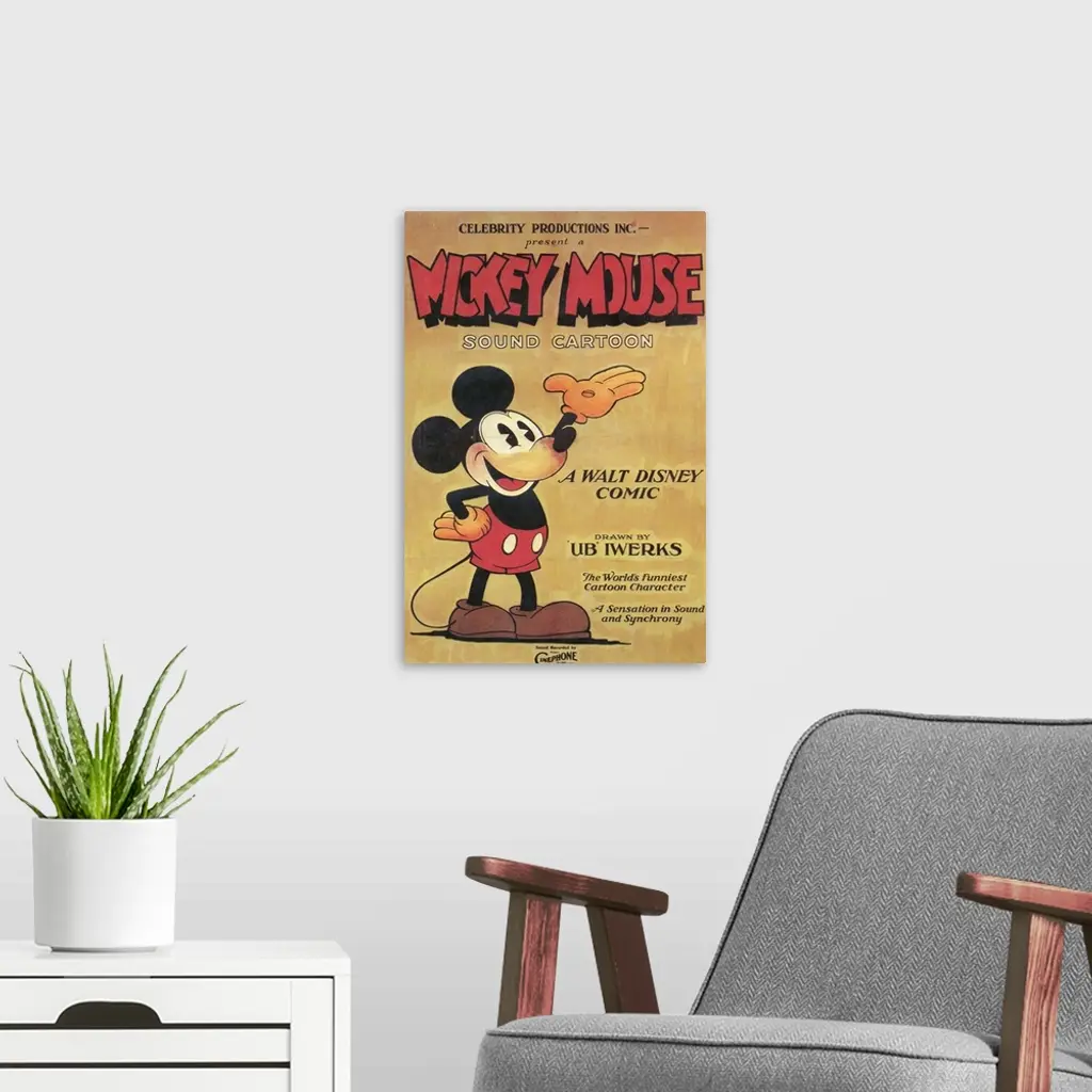 Portrait, large vintage advertisement for a Mickey Mouse sound cartoon from 1930. Mickey Mouse stands with one hand on his hip, the other in the air, surrounded by his name and descriptive text about the cartoon.