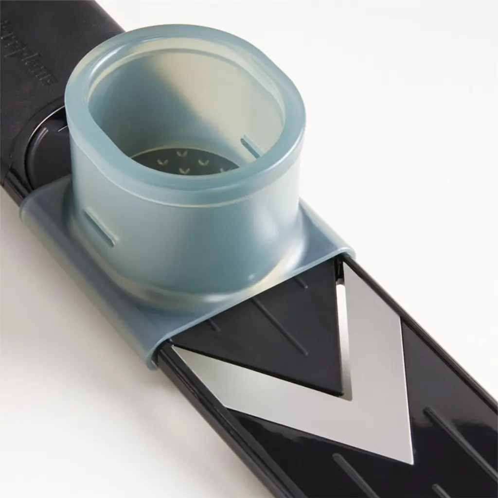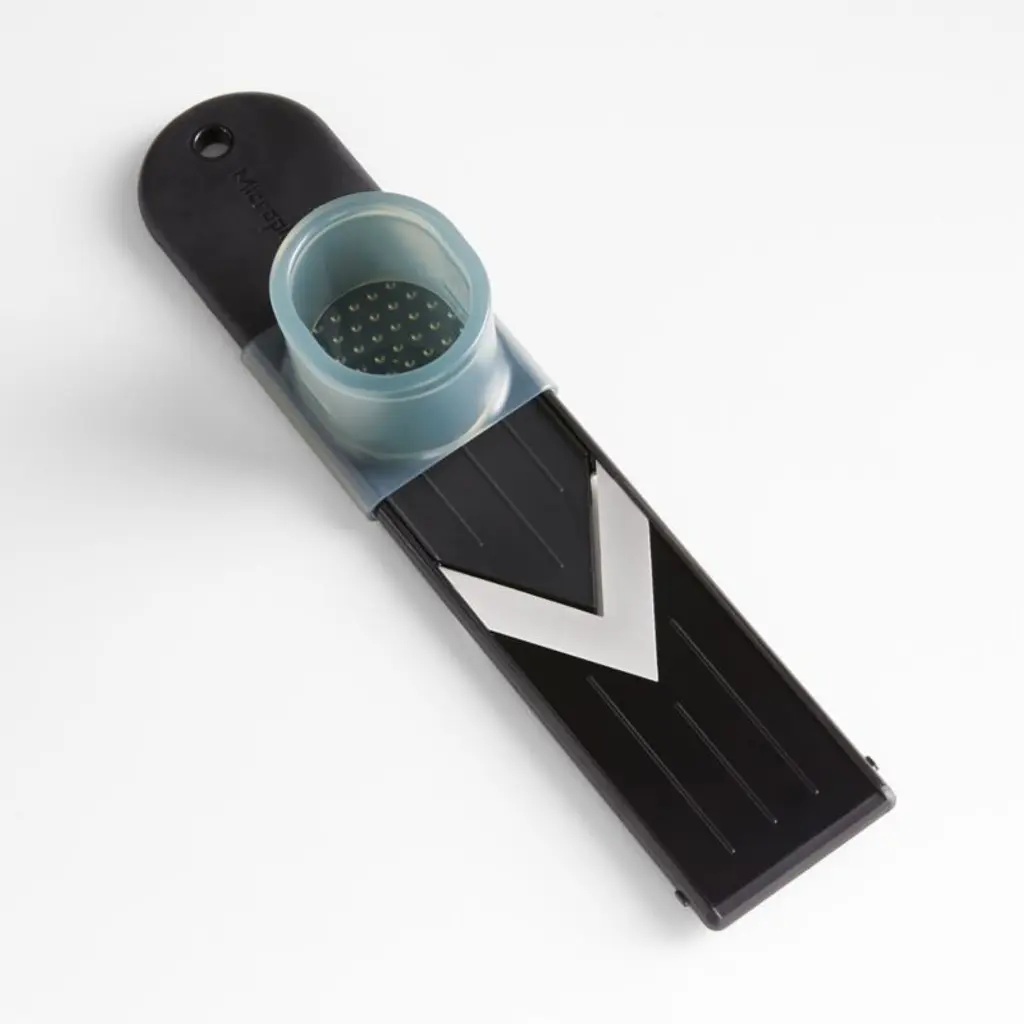 Slice delicate foods quickly, safely and precisely with this incredibly useful tool. Crafted with an ultra-sharp stainless steel blade, the mini mandoline slices strawberries, mushrooms, hard-boiled eggs and more. The nonslip base keeps the mandoline safely in place, and the adjustable blade offers three thickness levels. Use the sliding feeder attachment to keep fingers safe as you work and the protective cover to shield the blade during storage.Microplane, an employee-owned company, began crafting woodworking tools in the 1960s, eventually making a splash in the world of culinary tools with extremely sharp graters and zesters. For 30 years, Microplane kitchen blades have been prized for their long-lasting sharpness.