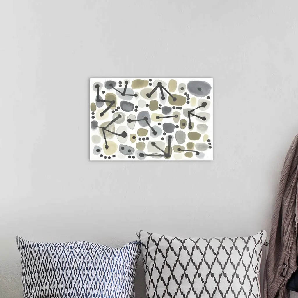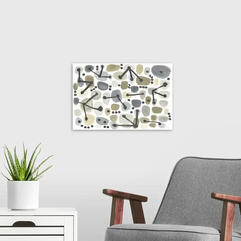 Neutral colored mid century modern decor with circular shapes and connecting lines.
