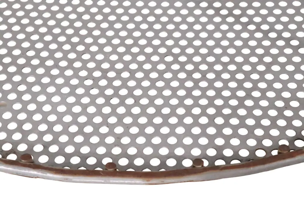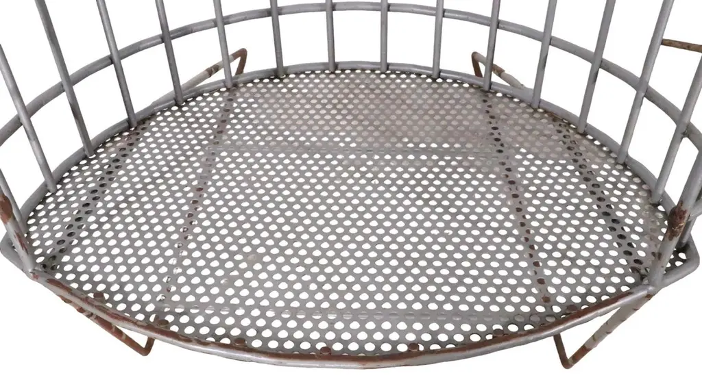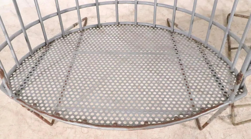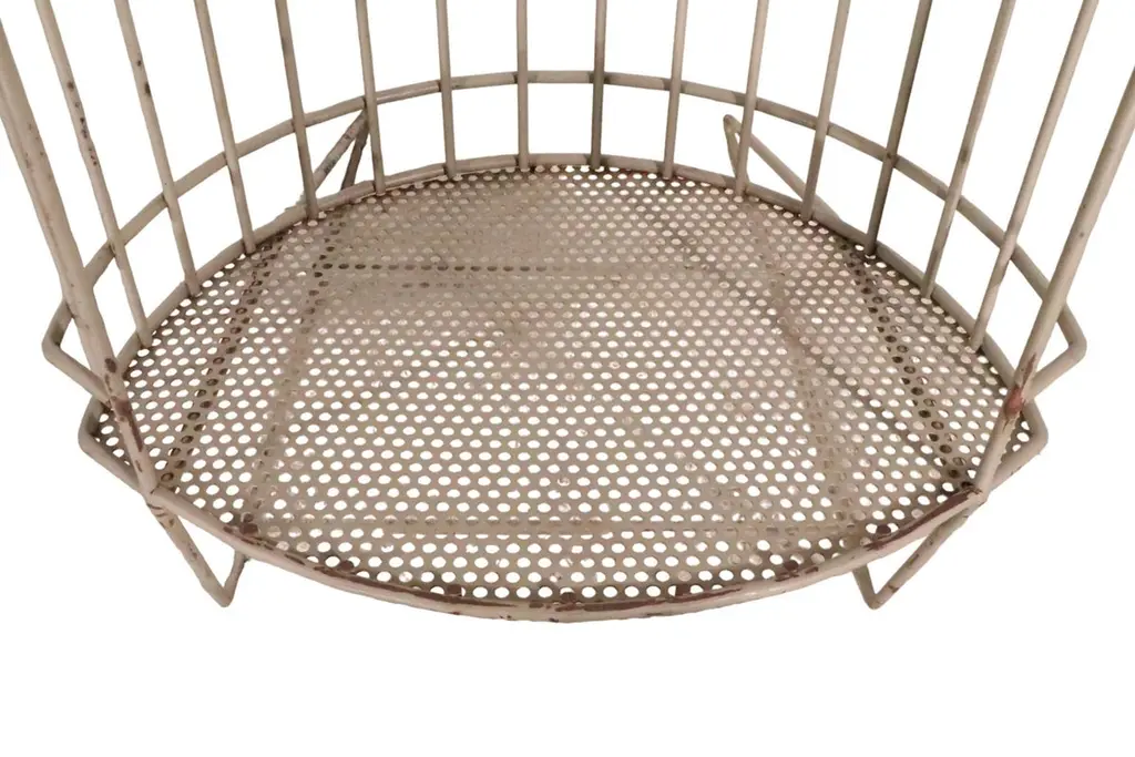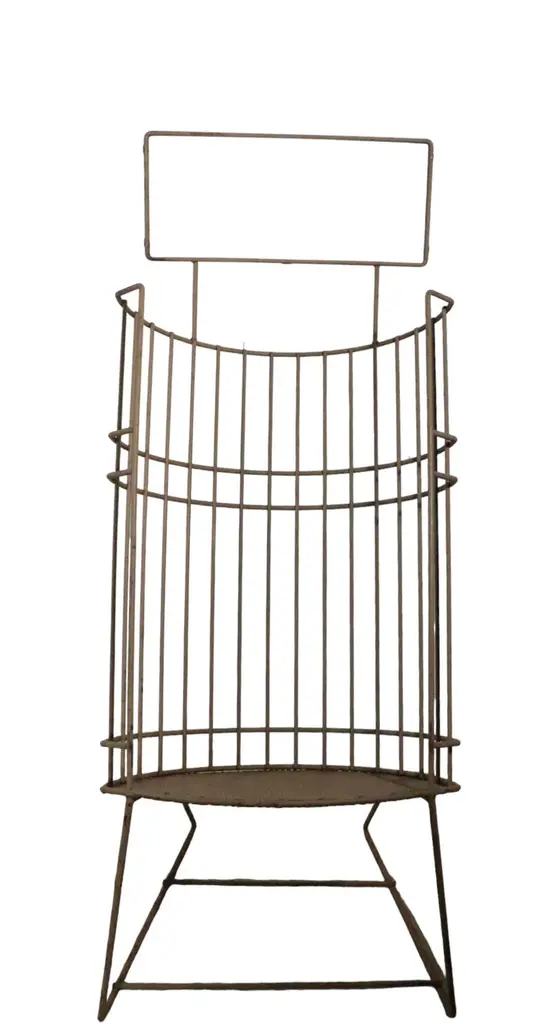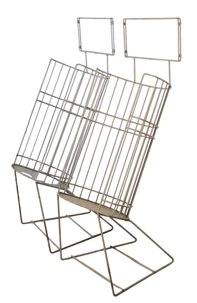 Architectural Mid Century store display stands constructed of welded iron rods, with an eye shaped bottom shelf of perforated metal. The oval body is canted back, and has an open front to access the items within. The body rests on angled rod legs, and the top features a frame to hold a display sign for your products. These stylish stands are great for use in a commercial setting, retail store, showroom etc, or use them in a residential setting if you prefer. One stand is in off white paint, the other in light gray paint finish. Both pieces are structurally sound and sturdy, both show minor cosmetic wear to the paint finish. Usable as is, or we also offer custom powder coating if you prefer a more polished look. Reminiscent of the work Umanoff, Mategot, and Weinberg, these pieces are unsigned. Offered and priced individually, but we would love to see them stay together.