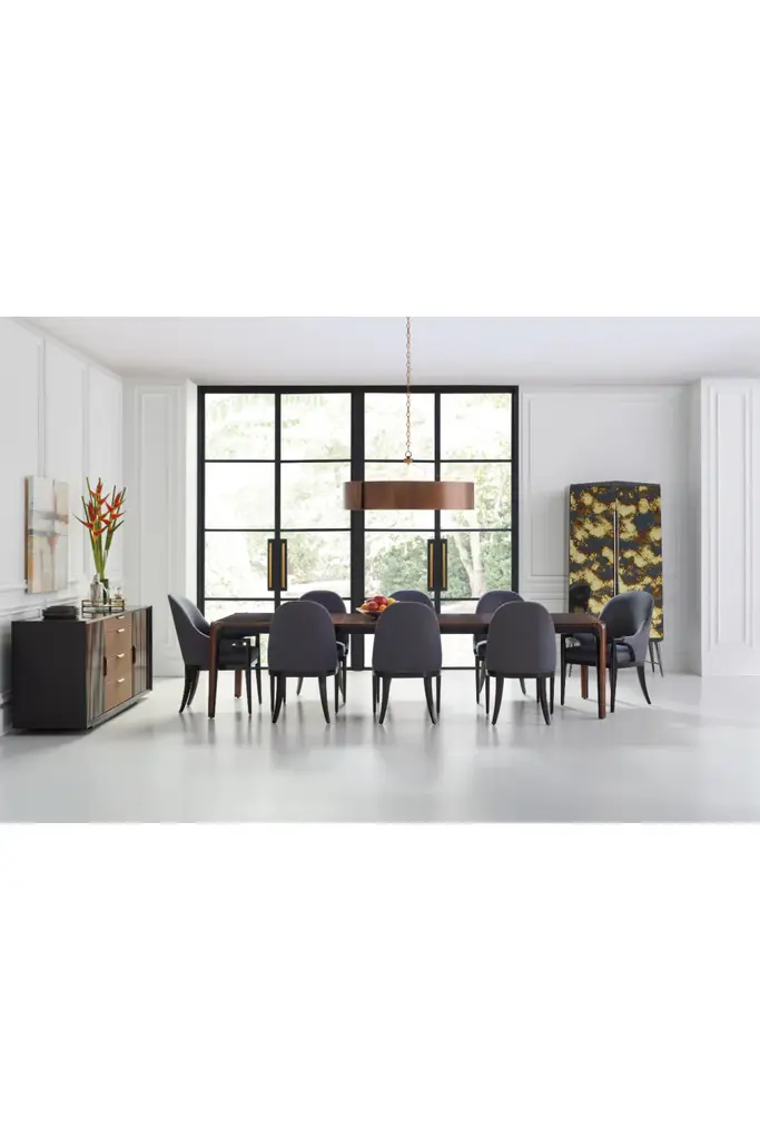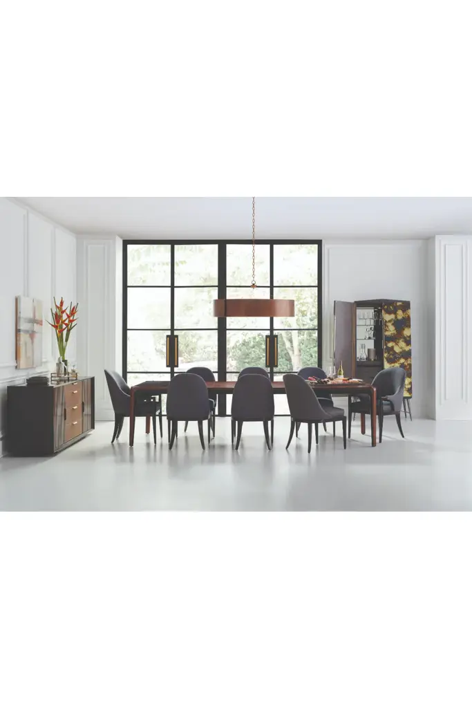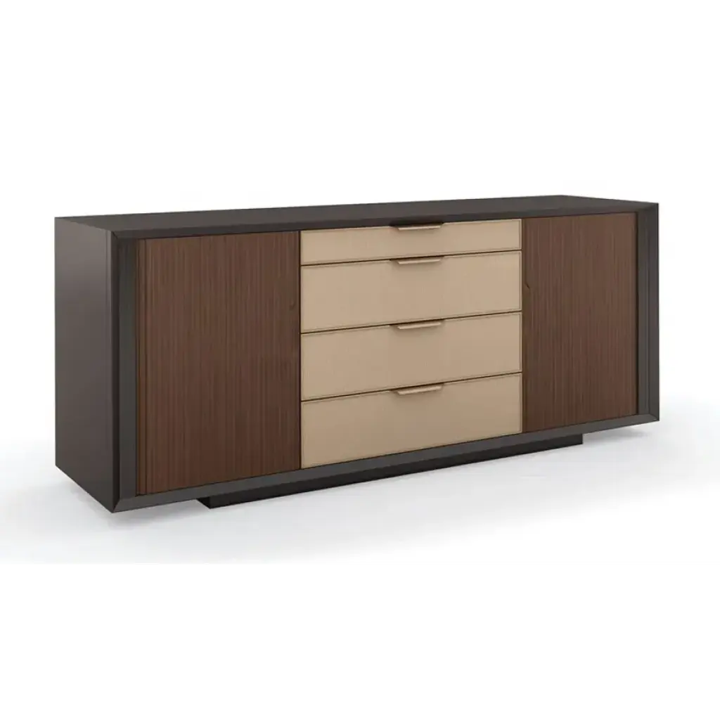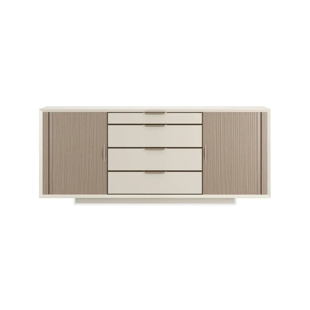 A masterful mix of form and function, this mid-century-inspired console stirs interest with its linear design and host of storage options. Sliding tambour doors in Rich Walnut add texture and contrast to a Dark Chocolate finish. Framed in Champagne Gold, four center drawers feature vinyl fronts, embossed with a pattern reminiscent of rain trickling down a windowpane. Expansive storage offers two fixed shelves on the left, offset by five soft close drawers on the right. Modern and multifunctional, its clean-lined design is well-suited for living, dining, and bedroom interiors.