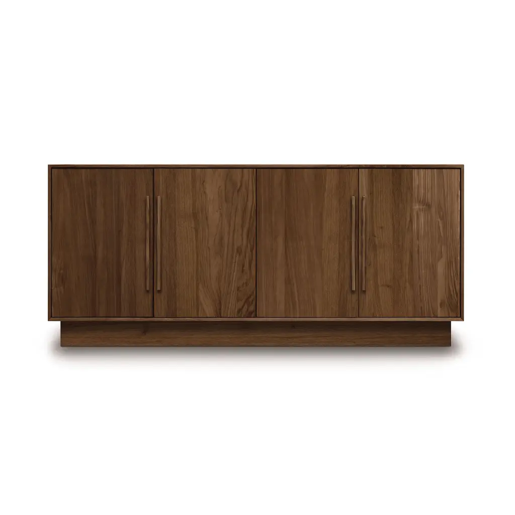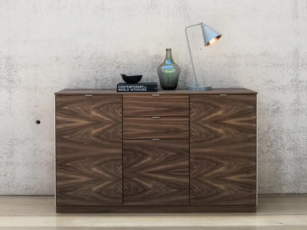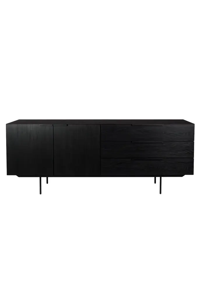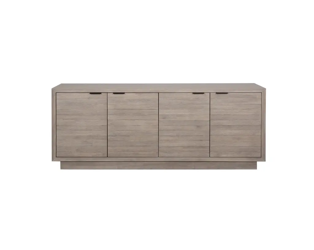 A masterful mix of form and function, this mid-century-inspired console stirs interest with its linear design and host of storage options. Sliding tambour doors in Rich Walnut add texture and contrast to a Dark Chocolate finish. Framed in Champagne Gold, four center drawers feature vinyl fronts, embossed with a pattern reminiscent of rain trickling down a windowpane. Expansive storage offers two fixed shelves on the left, offset by five soft close drawers on the right. Modern and multifunctional, its clean-lined design is well-suited for living, dining, and bedroom interiors.