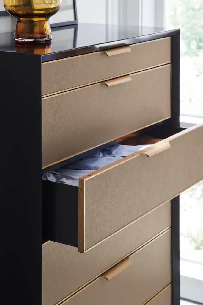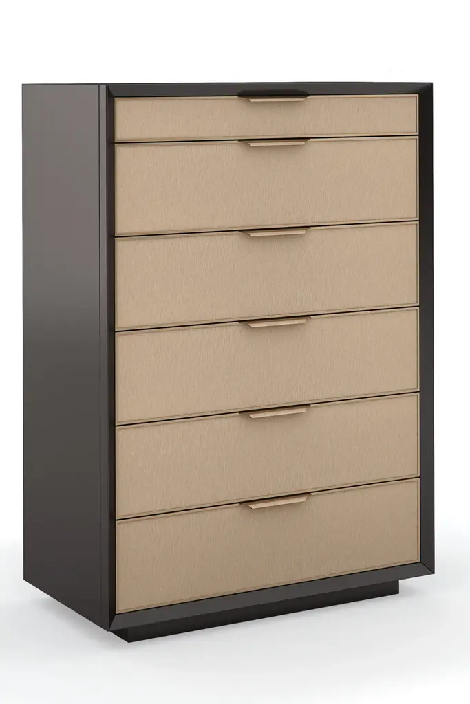 Introduce a sophisticated style to bedroom interiors with this architectural-inspired dresser, merging minimalism with elements of mid-century modern. Each drawer front is wrapped in a beautifully textured vinyl, embossed with a rivulet pattern like rain trickling down a windowpane. Metal trim in Champagne Gold artfully incorporates rounded pulls to seamlessly frame each drawer, designed to open and close with ease. A felt-lined top drawer is perfect for organizing cufflinks and jewelry.