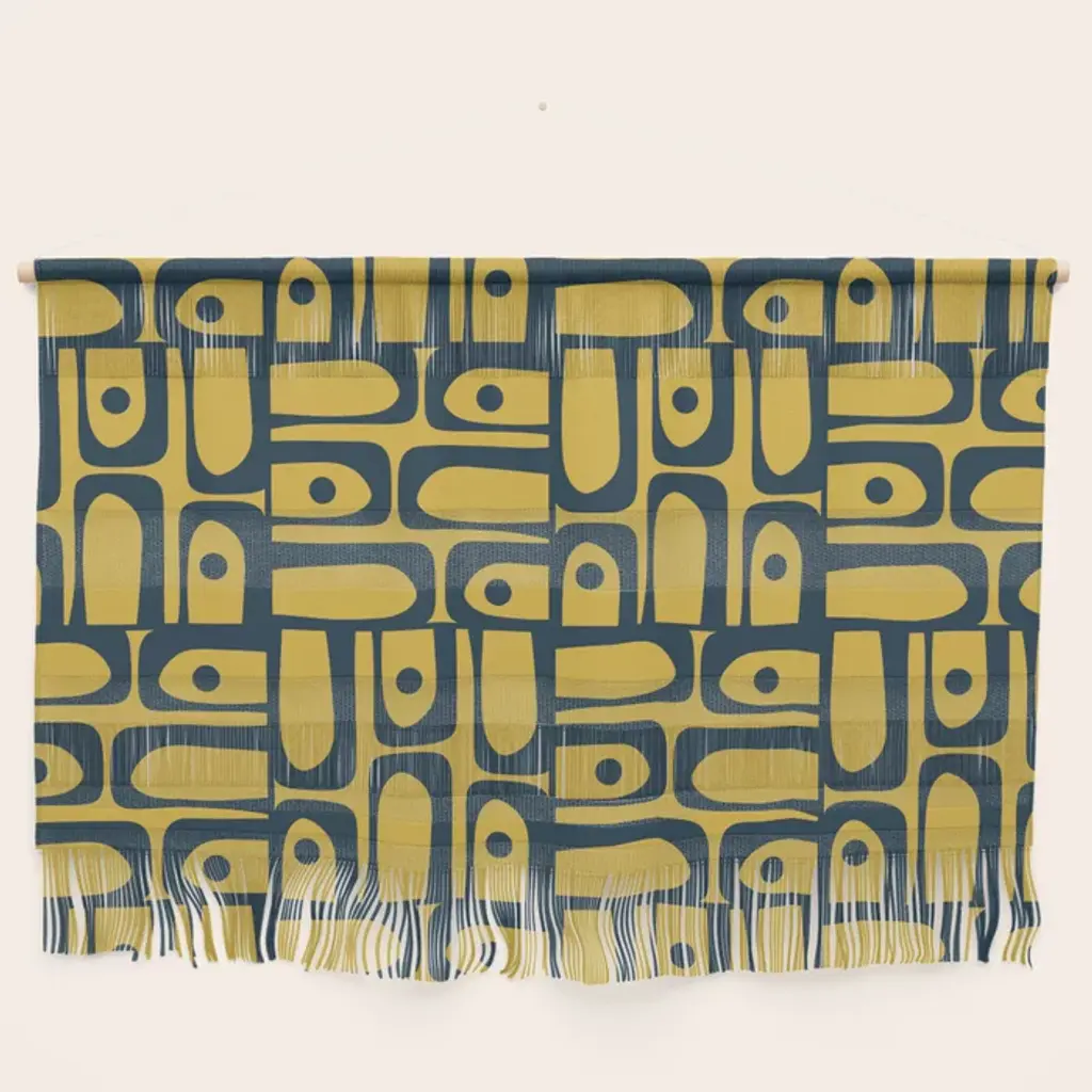 Mid Century Modern Piquet Abstract Multi Pattern In Golden Ochre Mustard And Beige Wall Hanging