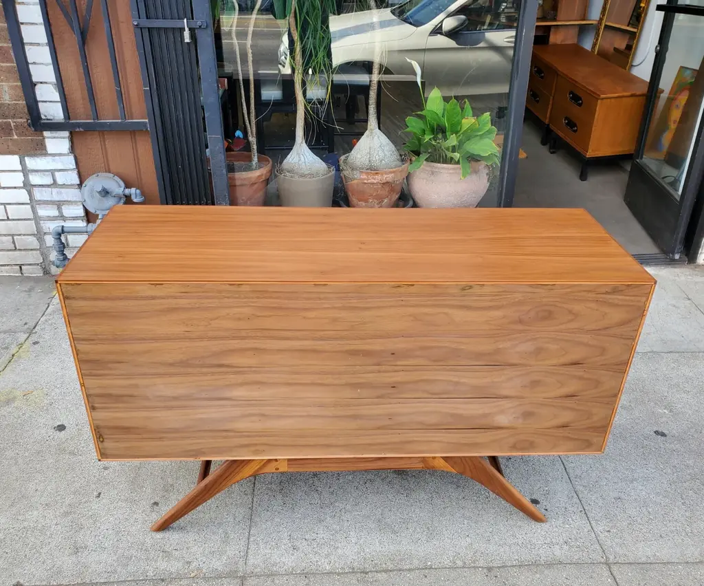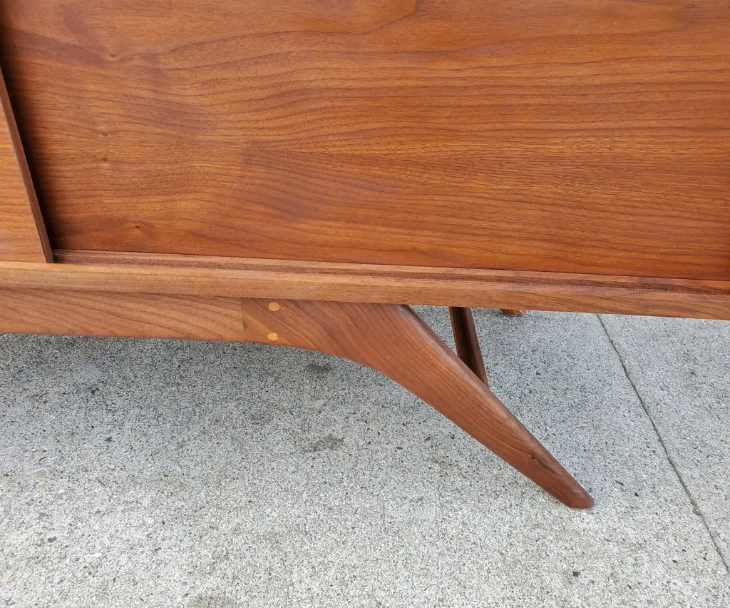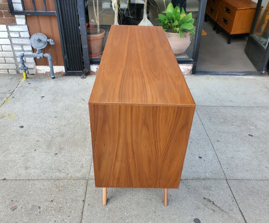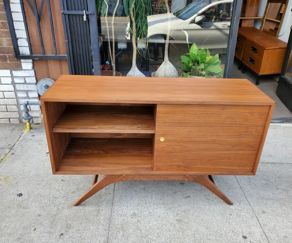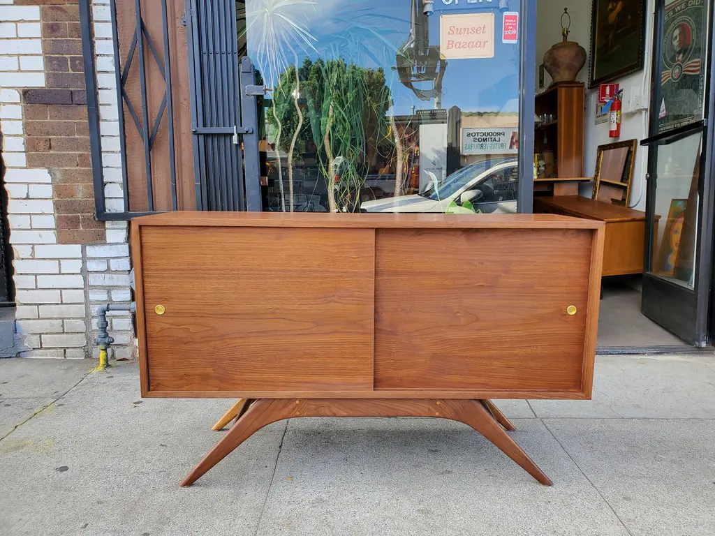 Mid-century style inspired, antenna base credenza. The credenza is hand made right here in Los Angeles, it features two sliding doors, two adjustable shelves, and a solid walnut antenna base. The piece is made out plywood walnut using the same technique as the times of old. Stunning wood grain, and really nice compact size to fit most modern homes. The credenza would also look great in an Art Deco home or an ultra modern loft.