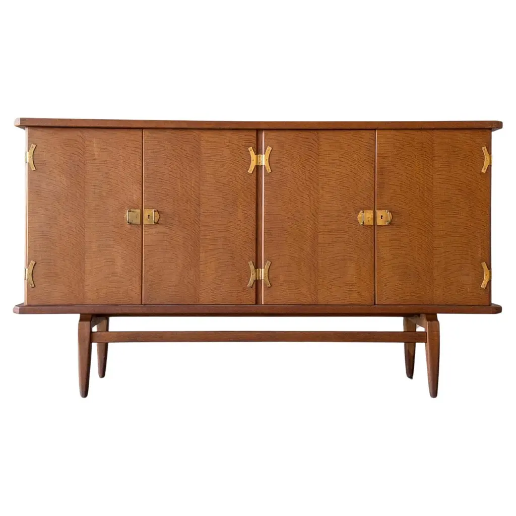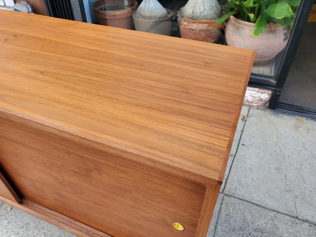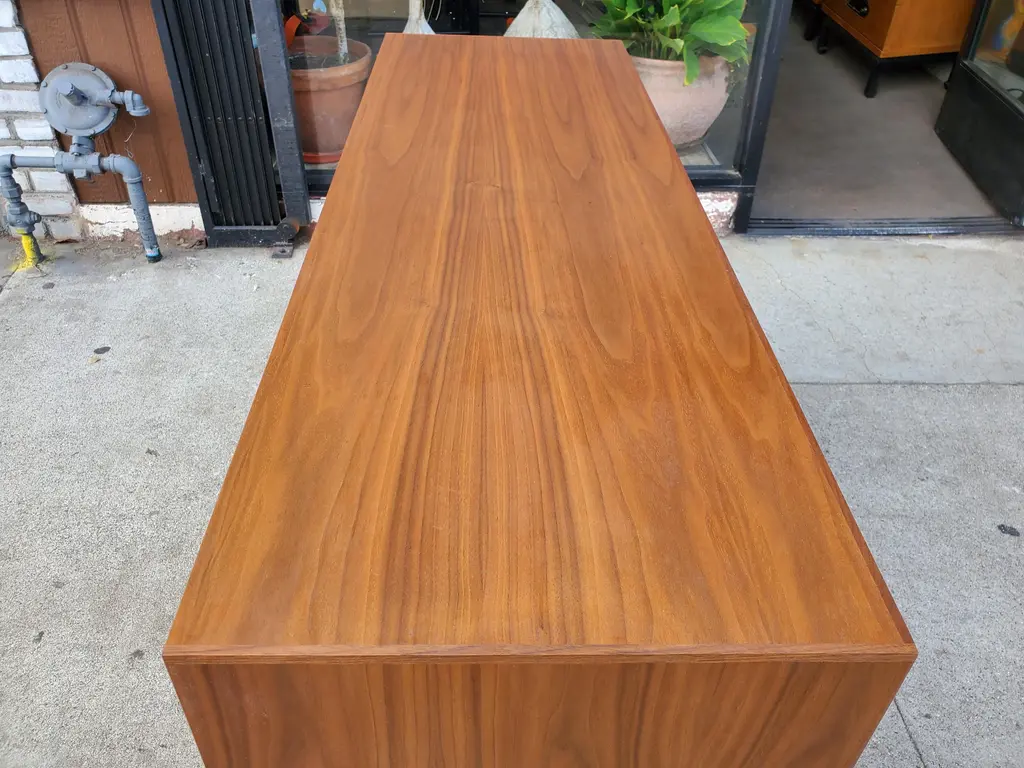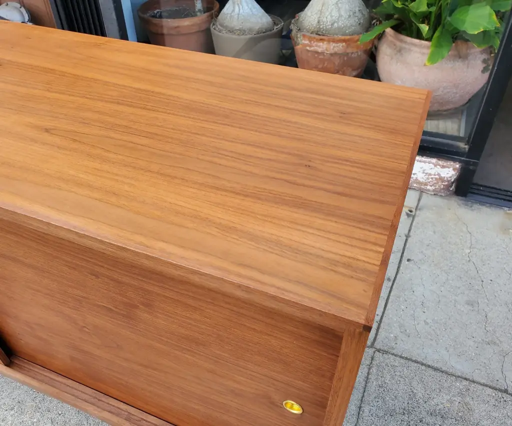 Mid-century style inspired, antenna base credenza. The credenza is hand made right here in Los Angeles, it features two sliding doors, two adjustable shelves, and a solid walnut antenna base. The piece is made out plywood walnut using the same technique as the times of old. Stunning wood grain, and really nice compact size to fit most modern homes. The credenza would also look great in an Art Deco home or an ultra modern loft.