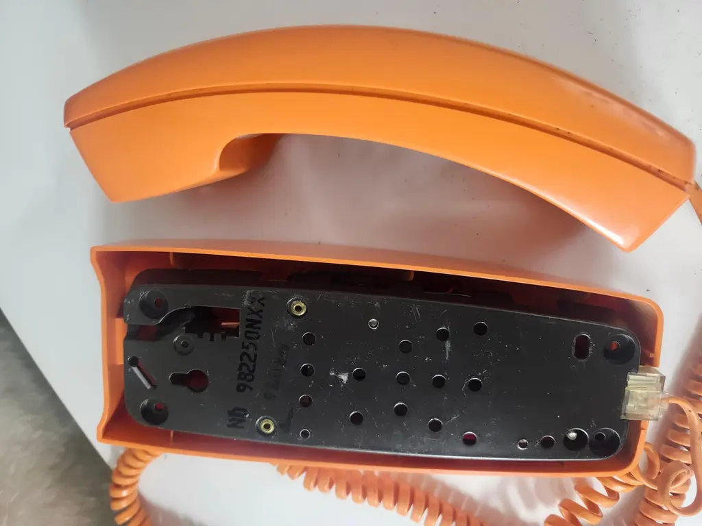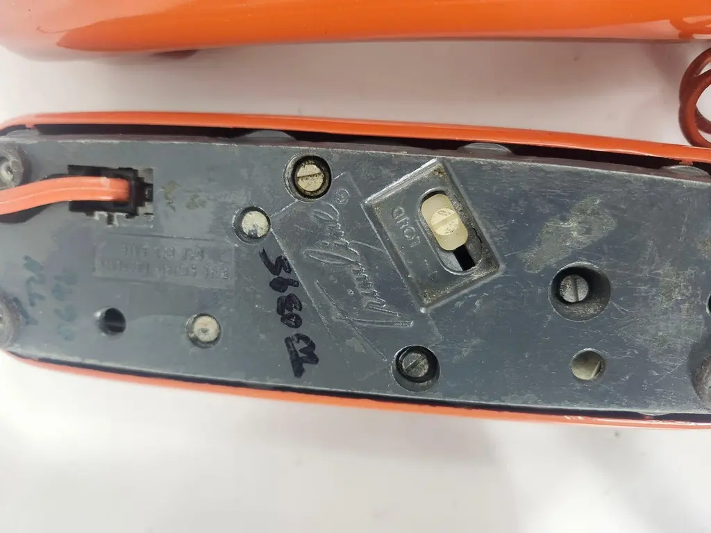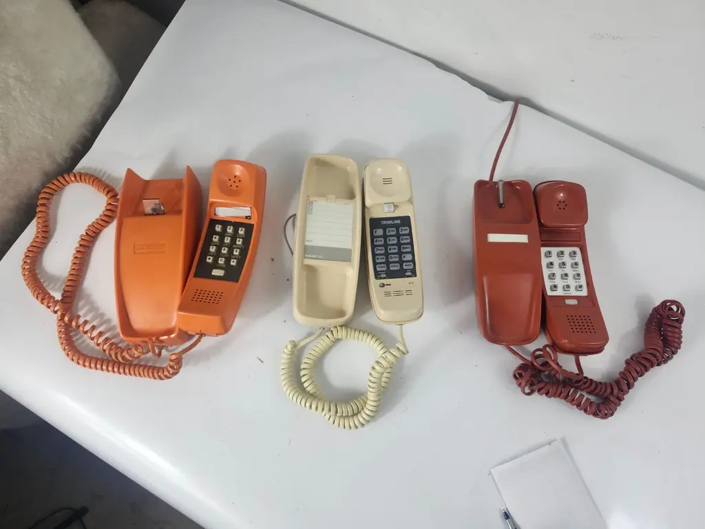 C1970 trimline telephones by 3 different companies. Different colors and the sizes are basically the same they do vary slughtly.All have the necessary cords to plug in. No damage to them, all are looking good with minimal wear from age and use. Priced and sold individually. Red, orange & white.
