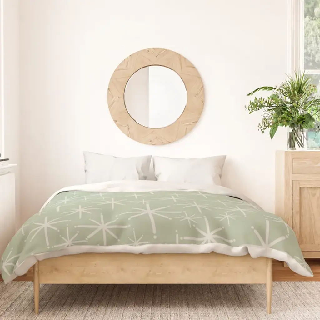 Mid Century Modern Twinkling Retro Starburst Pattern In Sage Green And Beige Duvet Cover