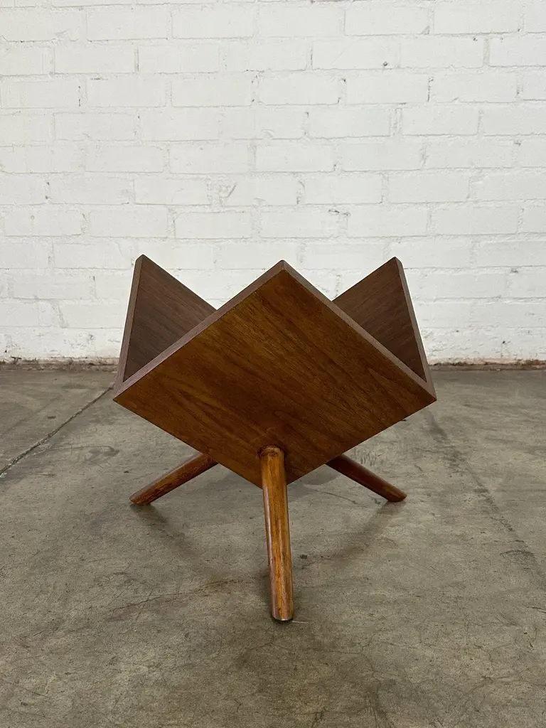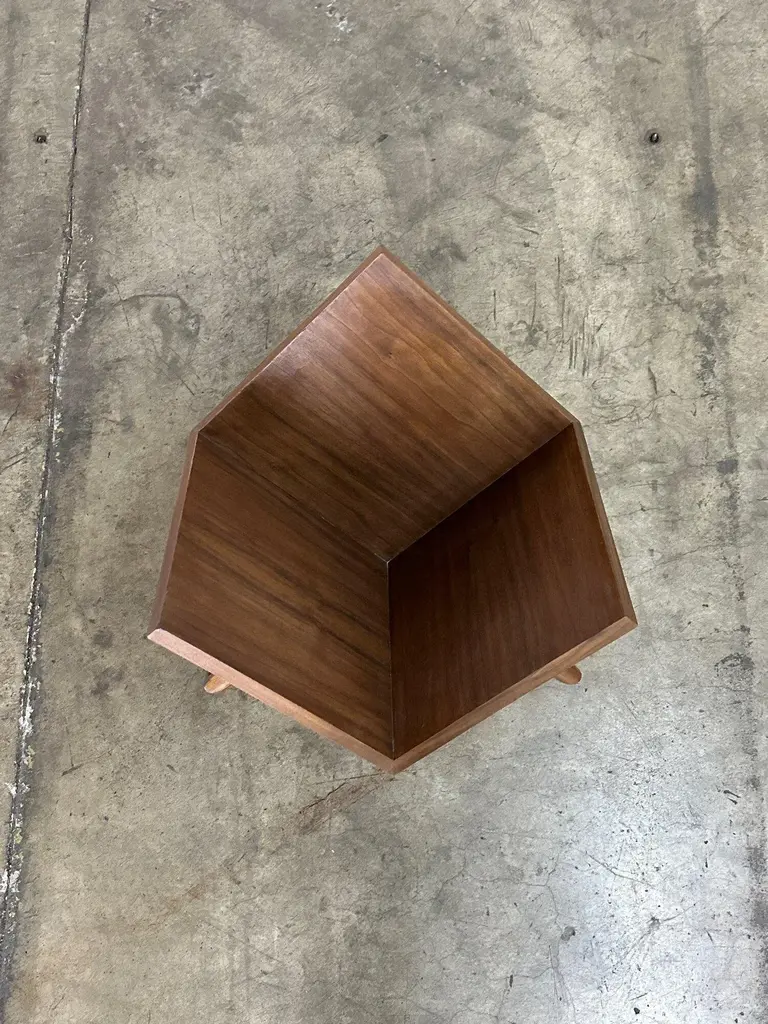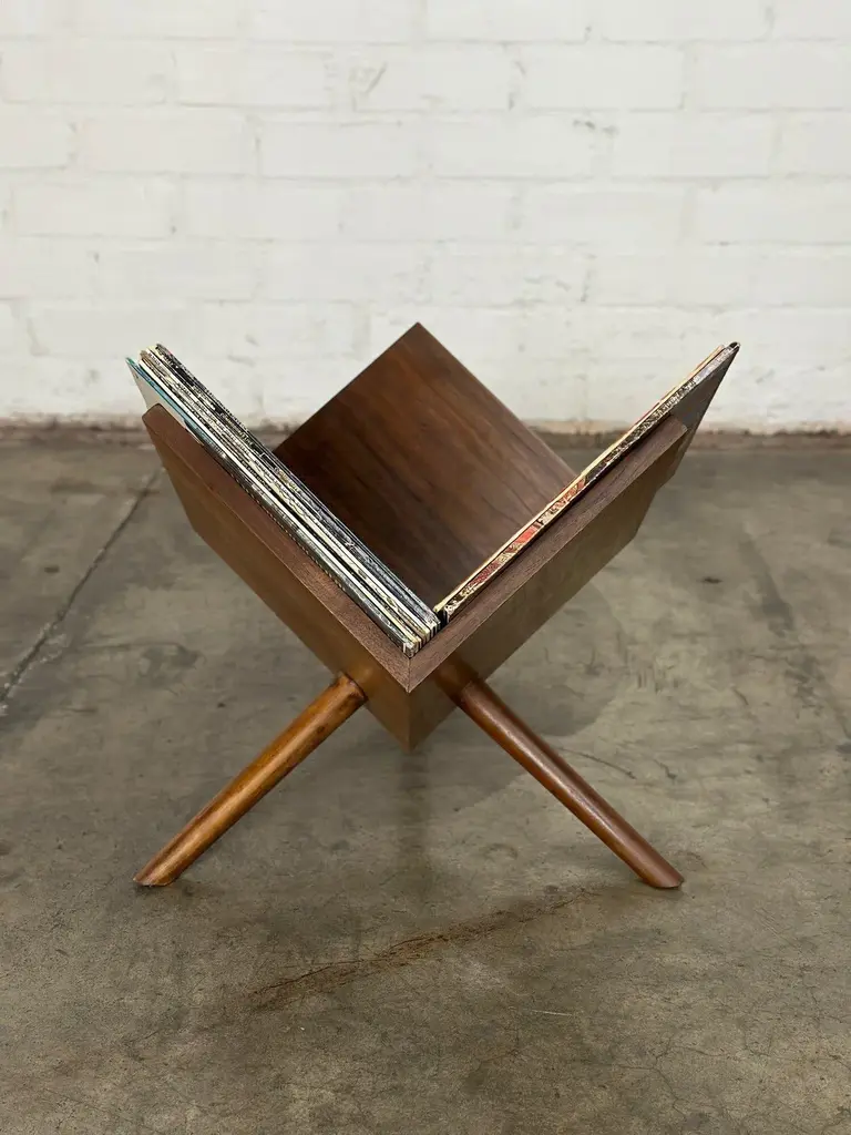 W20 D20 H16.5 These are made of walnut wood with a rich grain pattern. They were created to hold records, books and/ or magazines. They feature solid wood legs, walnut veneer over plywood and solid wood edges. This pieces can ship via ups ground to save on shipping costs. STYLES: Mid-Century ModernMinimalism