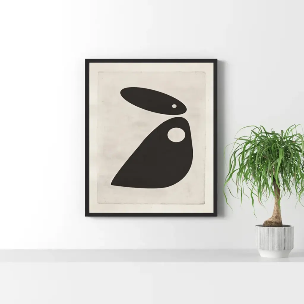 Inspired by mid-century art, this graphic print juxtaposes a crisp monochrome palette with the soft, friendly lines of two balanced abstract shapes. It’s giclee printed on paper using archival inks for an accurate + lasting reproduction, and arrives in a wooden frame.