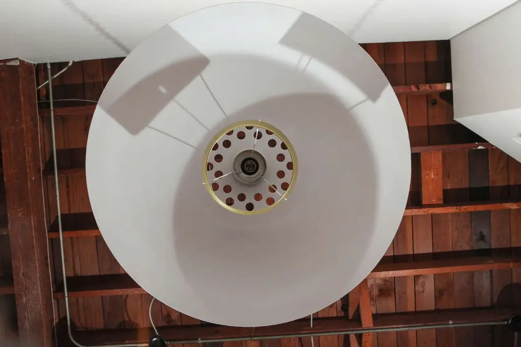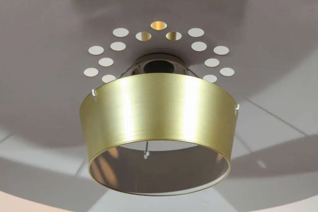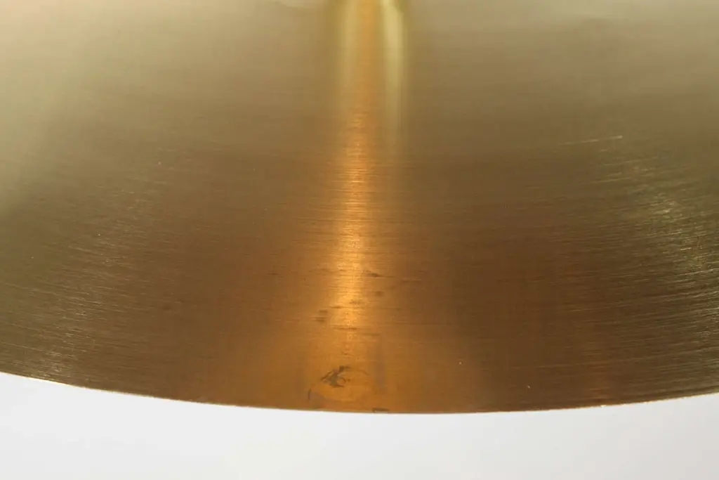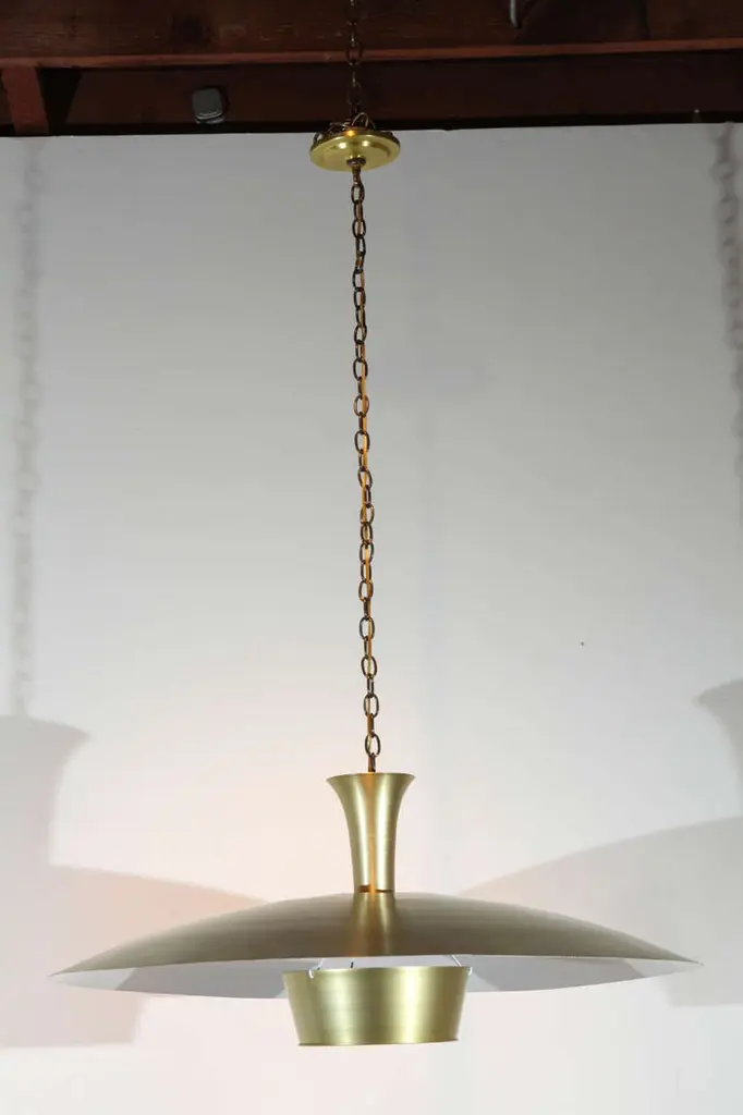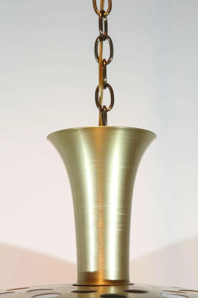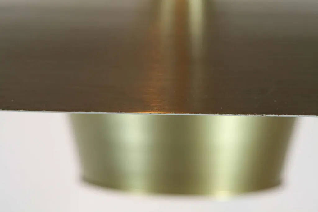 Spun aluminum fixture with anodized brass finish. Newly rewired for a single standard bulb. Ten available.