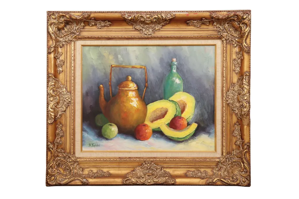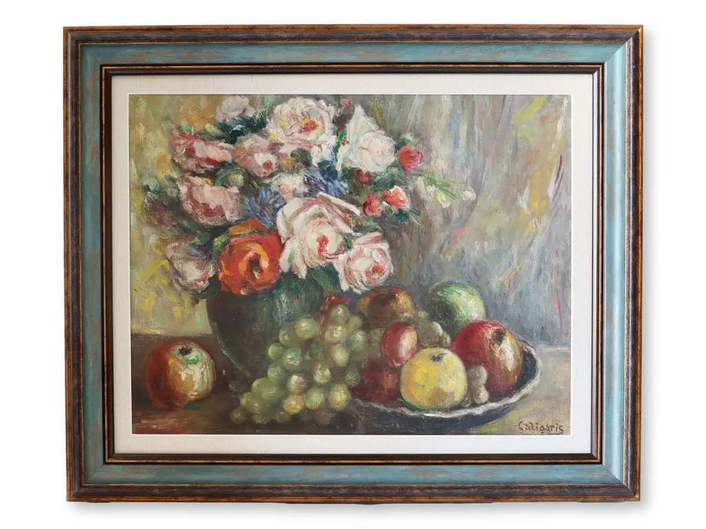 This vibrant midcentury French still life features a stunning arrangement of ripe pears, apples, and a bouquet of flowers in a green vase. The artist, signed as "Callegaris," beautifully captures the rich colors and textures in an impressionistic style. The warm gold-tone frame adds to its timeless appeal, making it perfect for any room.