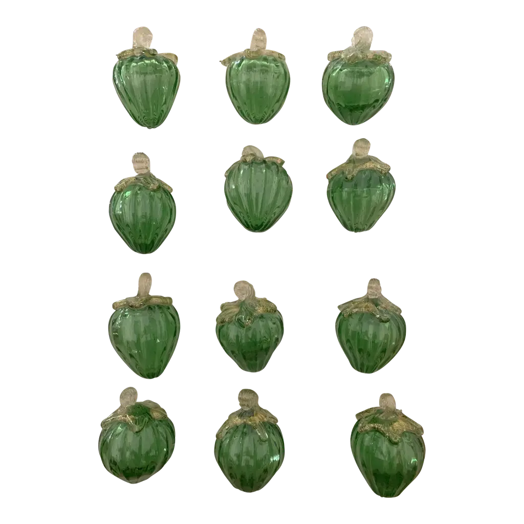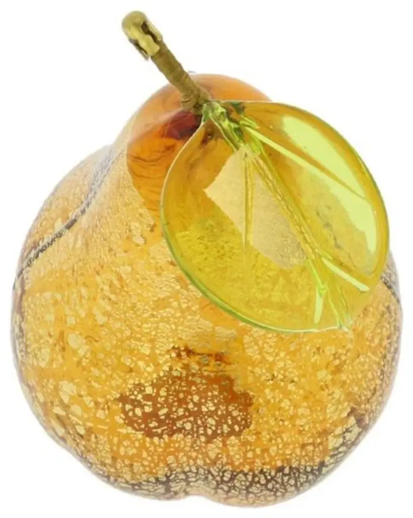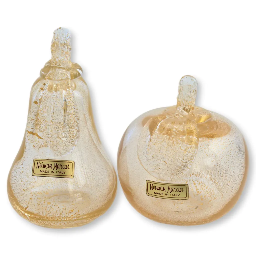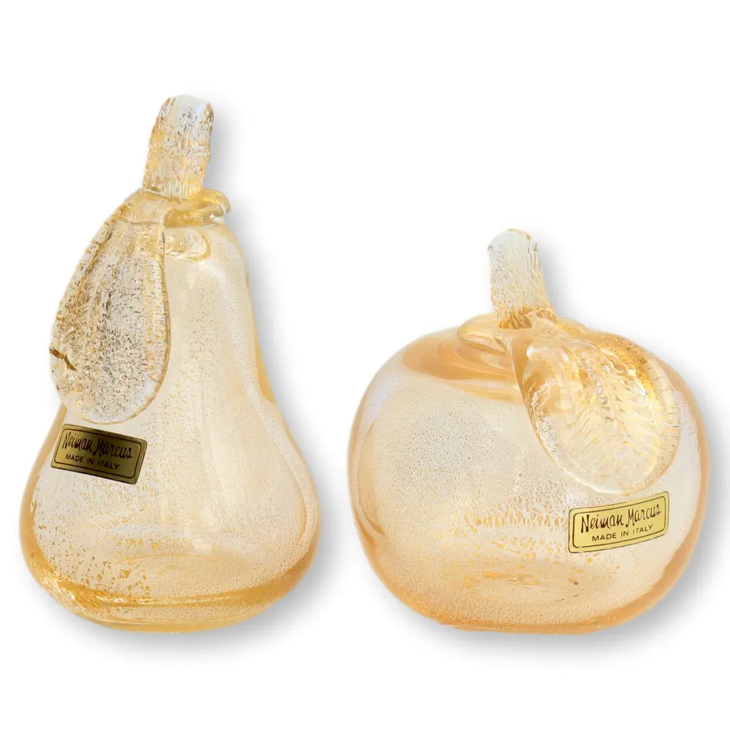 Two pieces of Italian handblown glass fruit. They retain their original stickers for Nieman Marcus. Clear blown glass with gold flakes. Dimensions: apple, 4"Dia x 4"H; pear, 3.25'Dia x 5.5"H. Maker's mark on front.