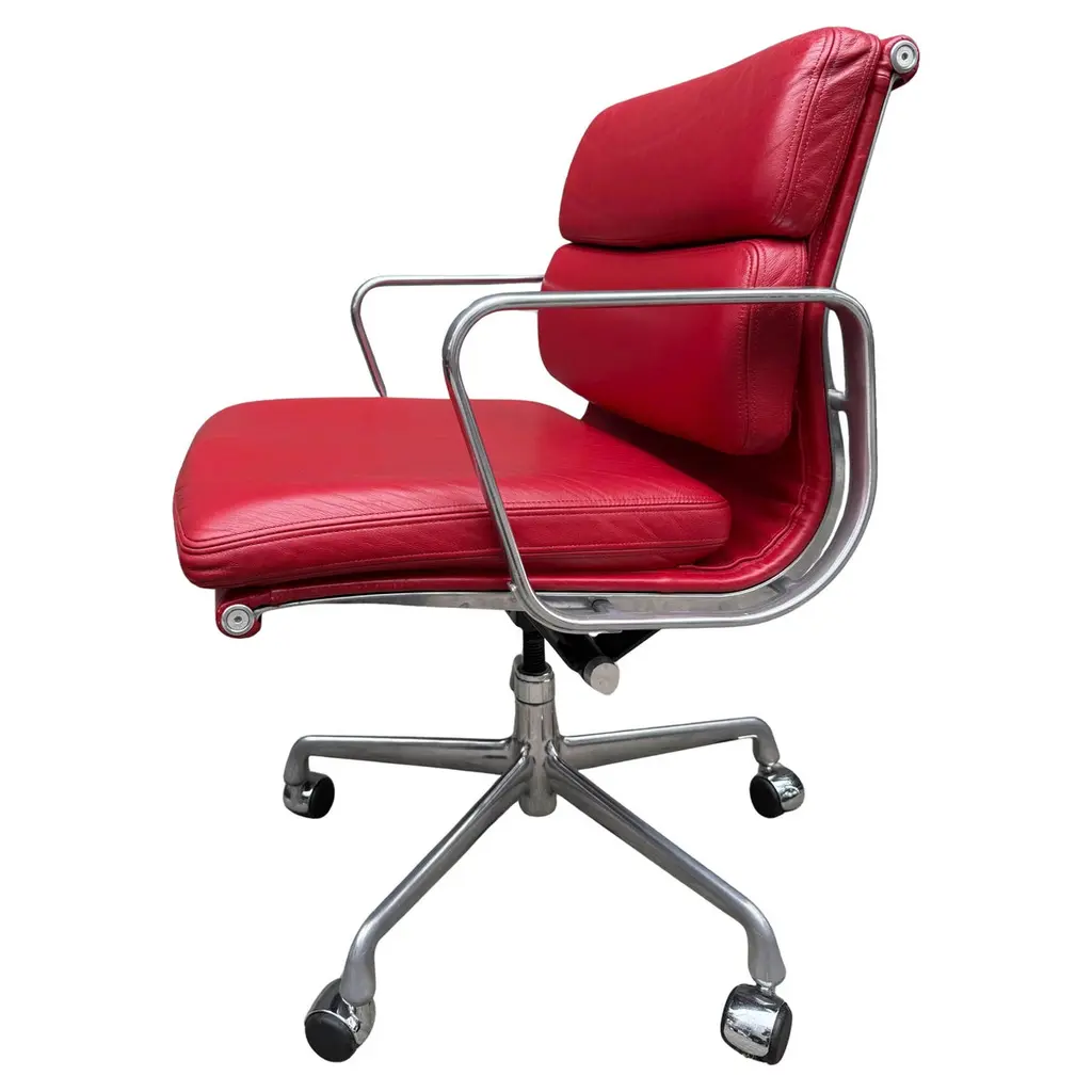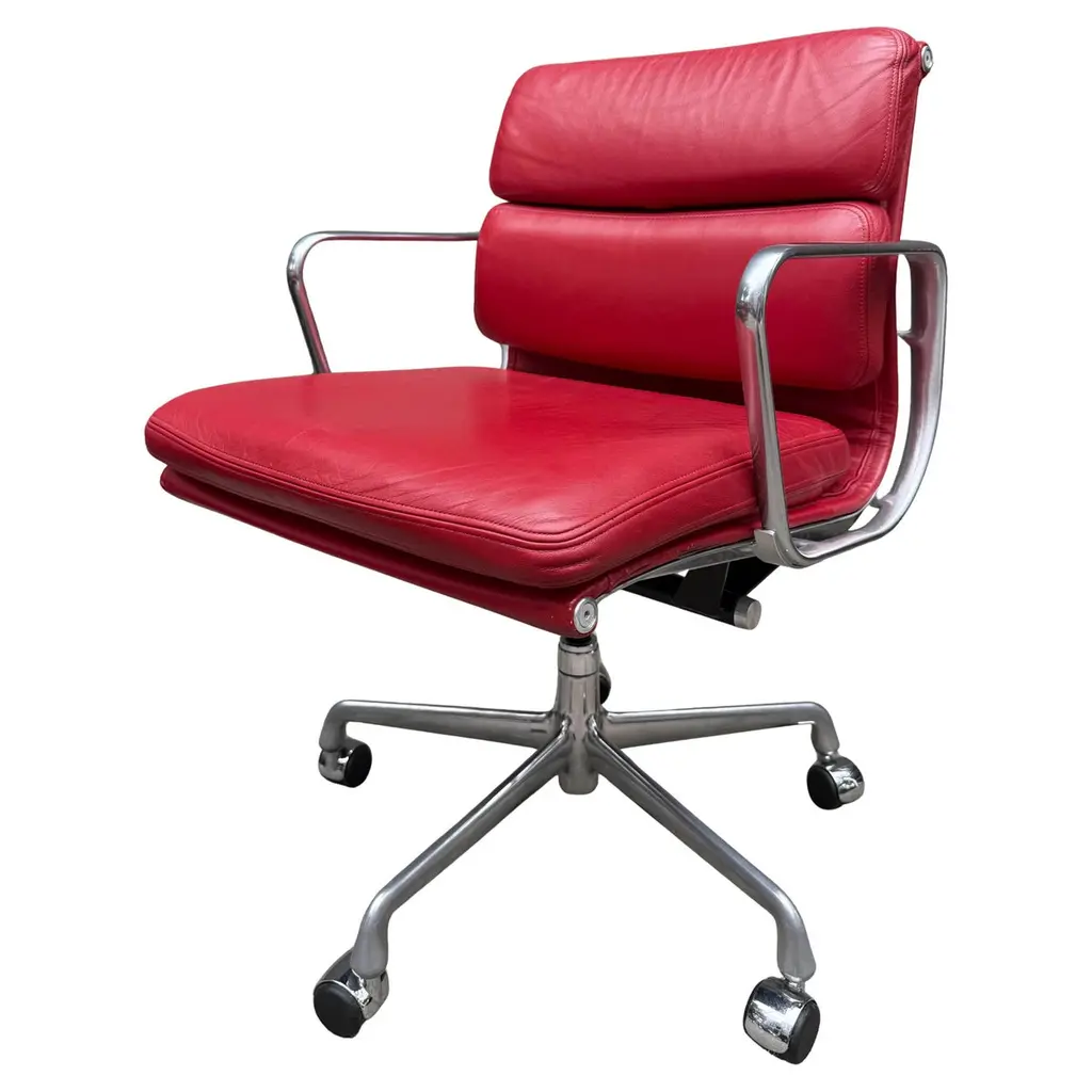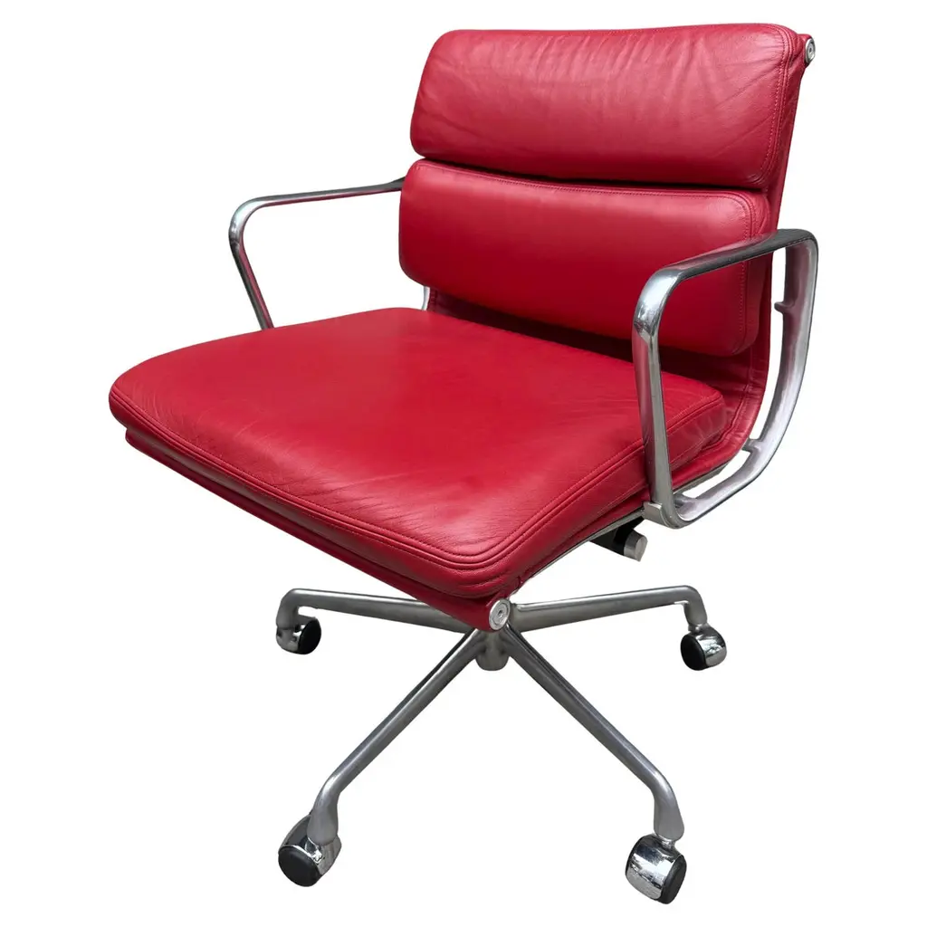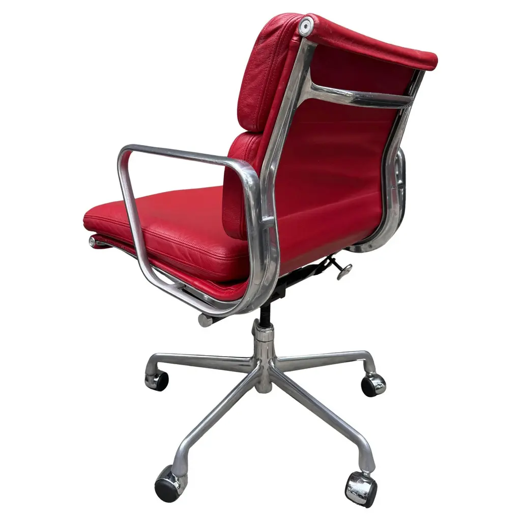 Authentic Vintage Eames Soft Pad Chairs for Herman Miller – Red LeatherFor your consideration: a striking pair of authentic vintage Eames Soft Pad Management Chairs, designed by Charles and Ray Eames for Herman Miller. Upholstered in bold red leather, these iconic chairs feature adjustable tilt and height via manual lift and sit atop the classic 5-star aluminum base.Part of the legendary Eames Aluminum Group, this design revolutionized office seating with its sleek profile and ergonomic comfort. These vintage originals are timeless representations of Mid-Century Modern design and remain in production by Herman Miller today—testament to their enduring appeal.Features:Authentic Eames for Herman Miller vintage piecesRed leather upholstery5-star aluminum baseAdjustable height and tilt (manual lift)Part of the iconic Aluminum Group seriesTimeless Mid-Century Modern designHeight (in): 36Height Min (in): 32¼Width (in): 23Depth (in): 16½Weight (lbs): 40Seat Height (in): 21½Seat Height Min (in): 19¾Seat Depth (in): 16½📍 Ships from Brooklyn, NYC — contact us for a custom shipping quote..