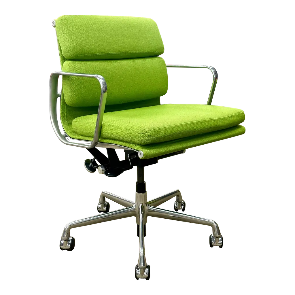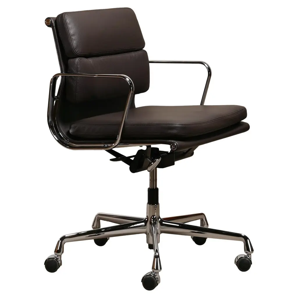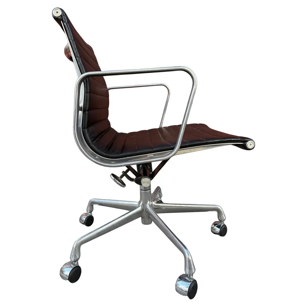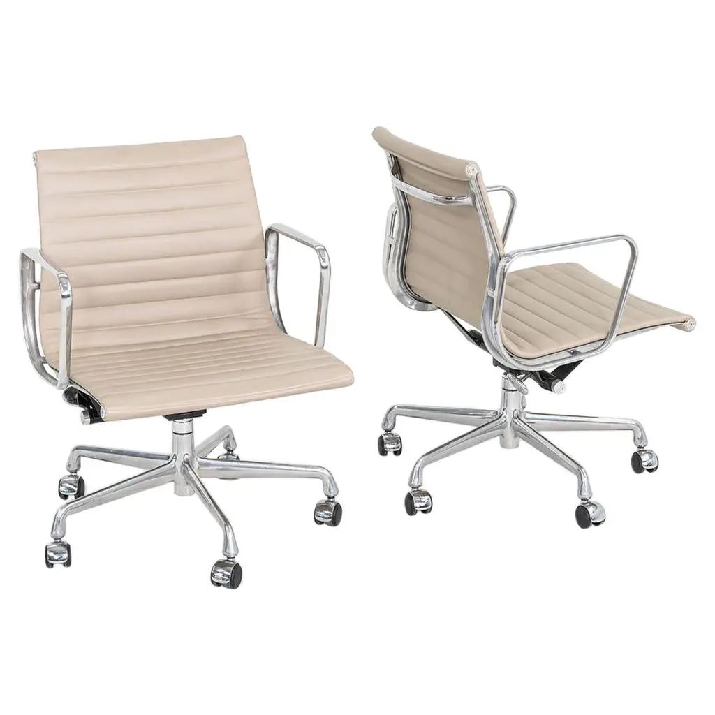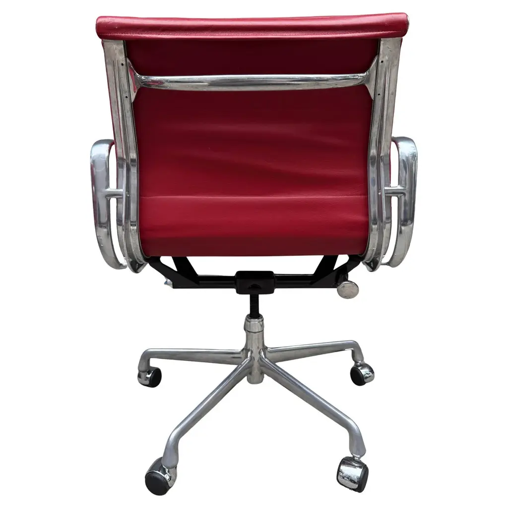 Authentic Vintage Eames Soft Pad Chairs for Herman Miller – Red LeatherFor your consideration: a striking pair of authentic vintage Eames Soft Pad Management Chairs, designed by Charles and Ray Eames for Herman Miller. Upholstered in bold red leather, these iconic chairs feature adjustable tilt and height via manual lift and sit atop the classic 5-star aluminum base.Part of the legendary Eames Aluminum Group, this design revolutionized office seating with its sleek profile and ergonomic comfort. These vintage originals are timeless representations of Mid-Century Modern design and remain in production by Herman Miller today—testament to their enduring appeal.Features:Authentic Eames for Herman Miller vintage piecesRed leather upholstery5-star aluminum baseAdjustable height and tilt (manual lift)Part of the iconic Aluminum Group seriesTimeless Mid-Century Modern designHeight (in): 36Height Min (in): 32¼Width (in): 23Depth (in): 16½Weight (lbs): 40Seat Height (in): 21½Seat Height Min (in): 19¾Seat Depth (in): 16½📍 Ships from Brooklyn, NYC — contact us for a custom shipping quote..