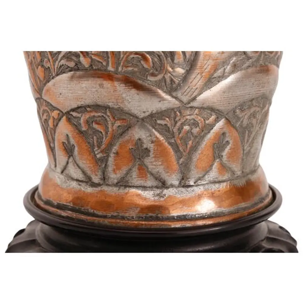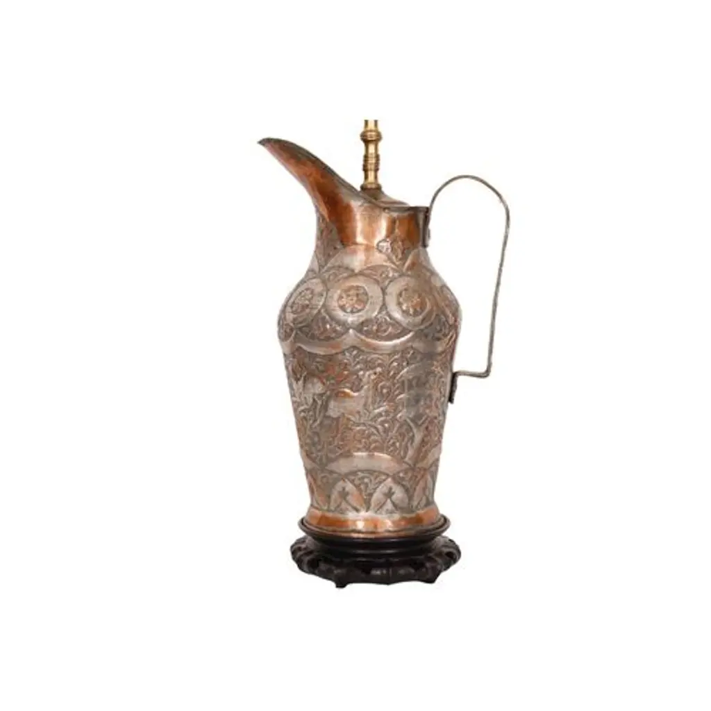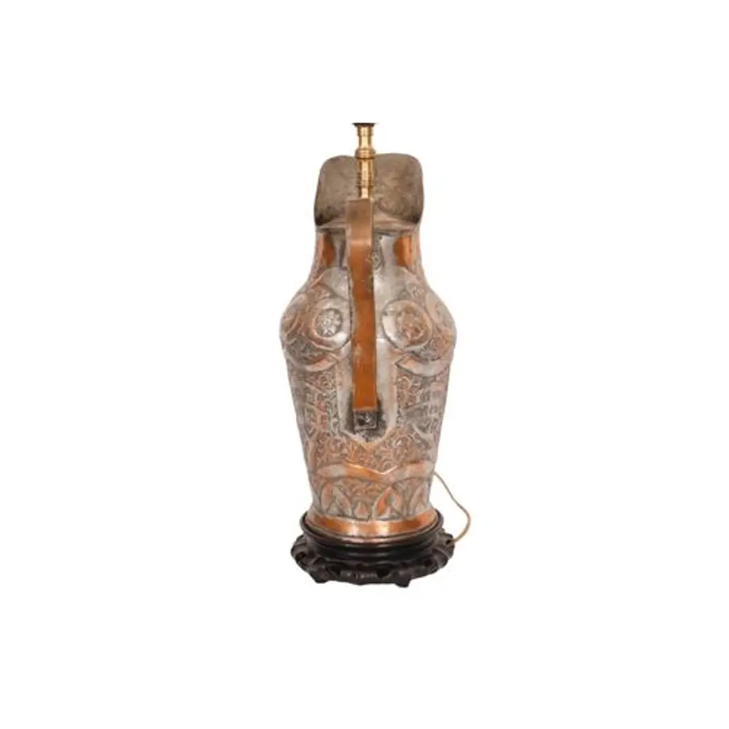 A 19th century Middle Eastern silver over copper and brass water pitcher, converted into a table lamp. The pitcher has a riveted handle and is etched with deer amid vine foliage on the main body, a flower pattern around the neck and a symmetrical pattern around the bottom. Sits on an ornately carved ebonised base. Measures 19"H to top of the socket, 31"H to top of the finial.