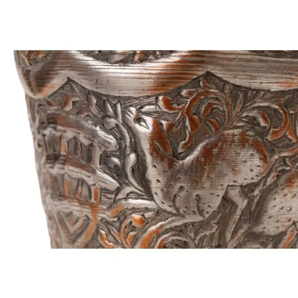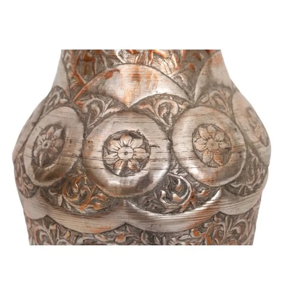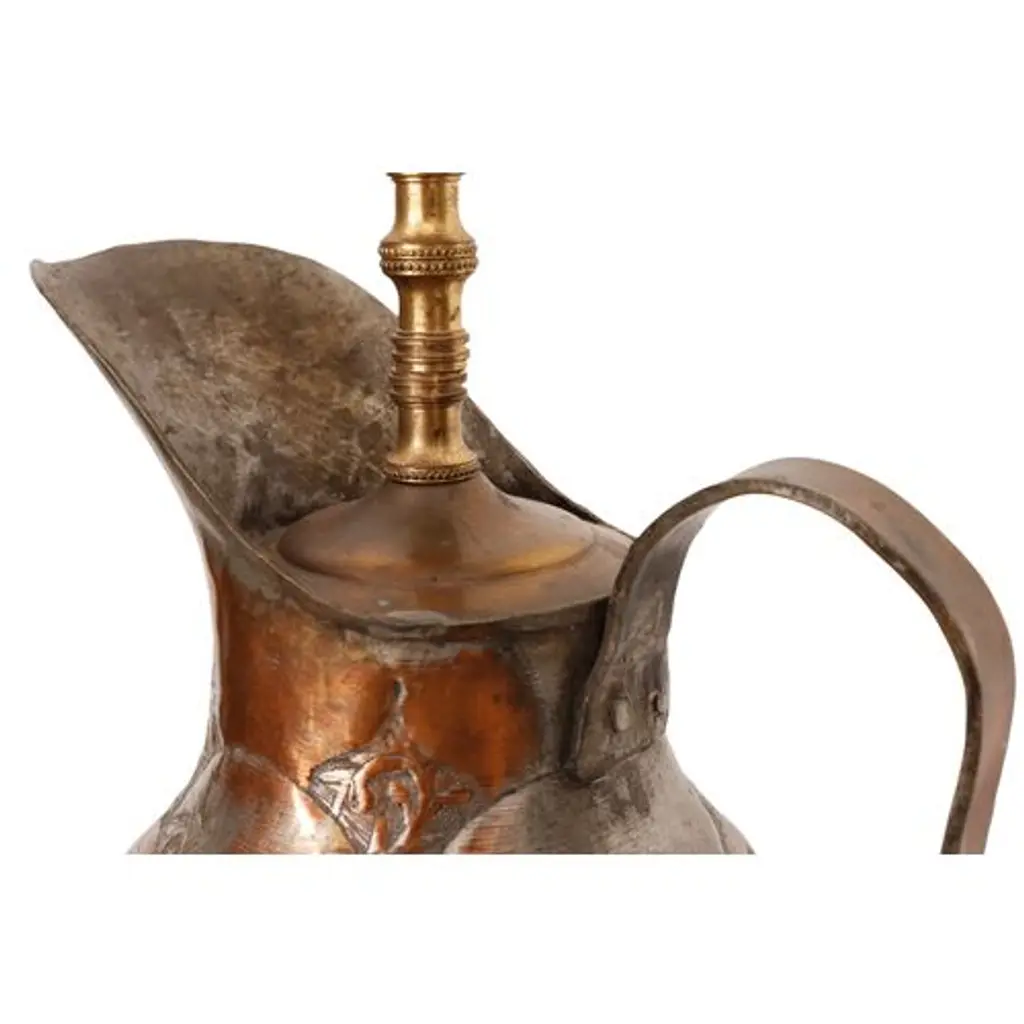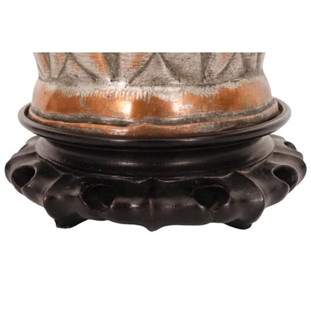 A 19th century Middle Eastern silver over copper and brass water pitcher, converted into a table lamp. The pitcher has a riveted handle and is etched with deer amid vine foliage on the main body, a flower pattern around the neck and a symmetrical pattern around the bottom. Sits on an ornately carved ebonised base. Measures 19"H to top of the socket, 31"H to top of the finial.