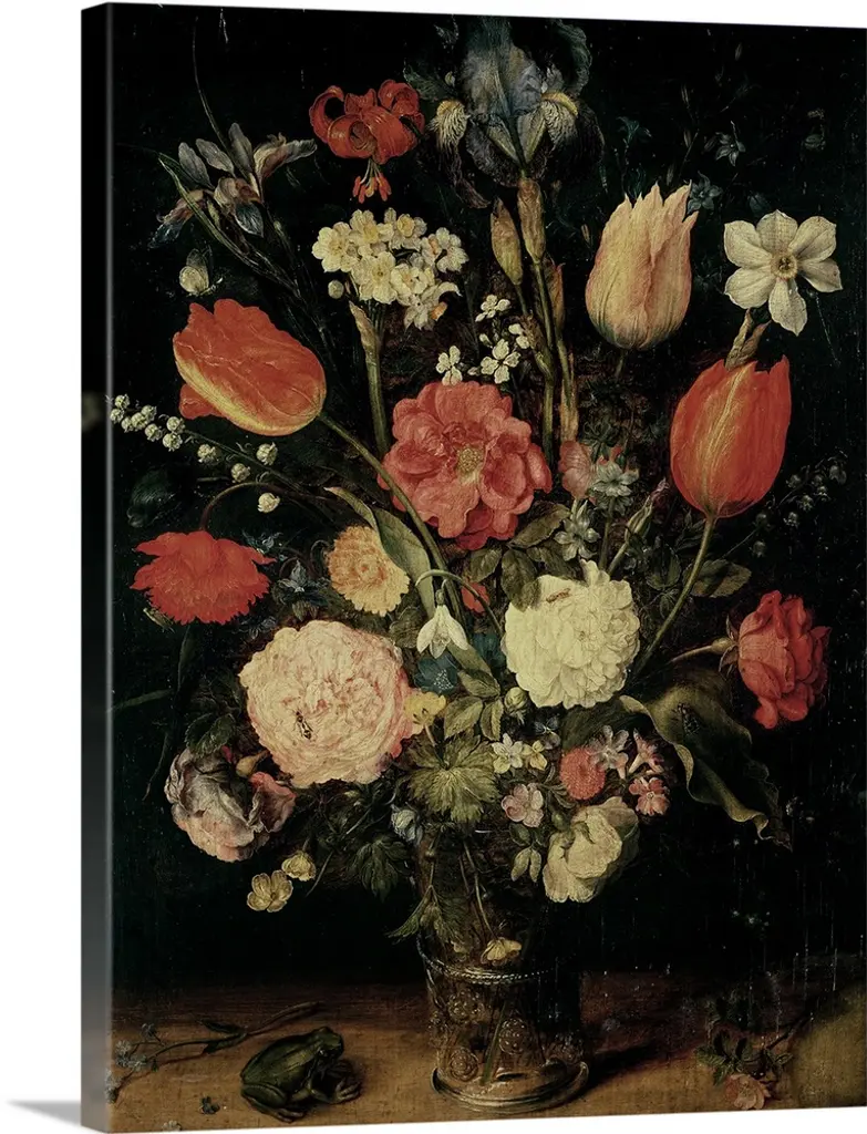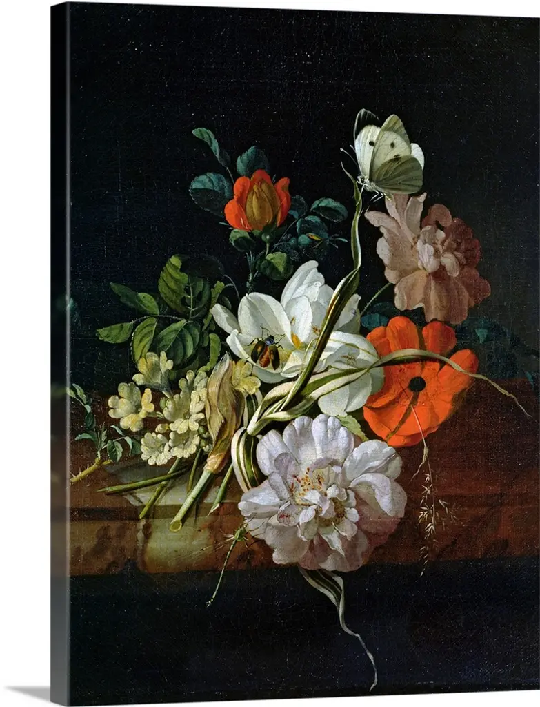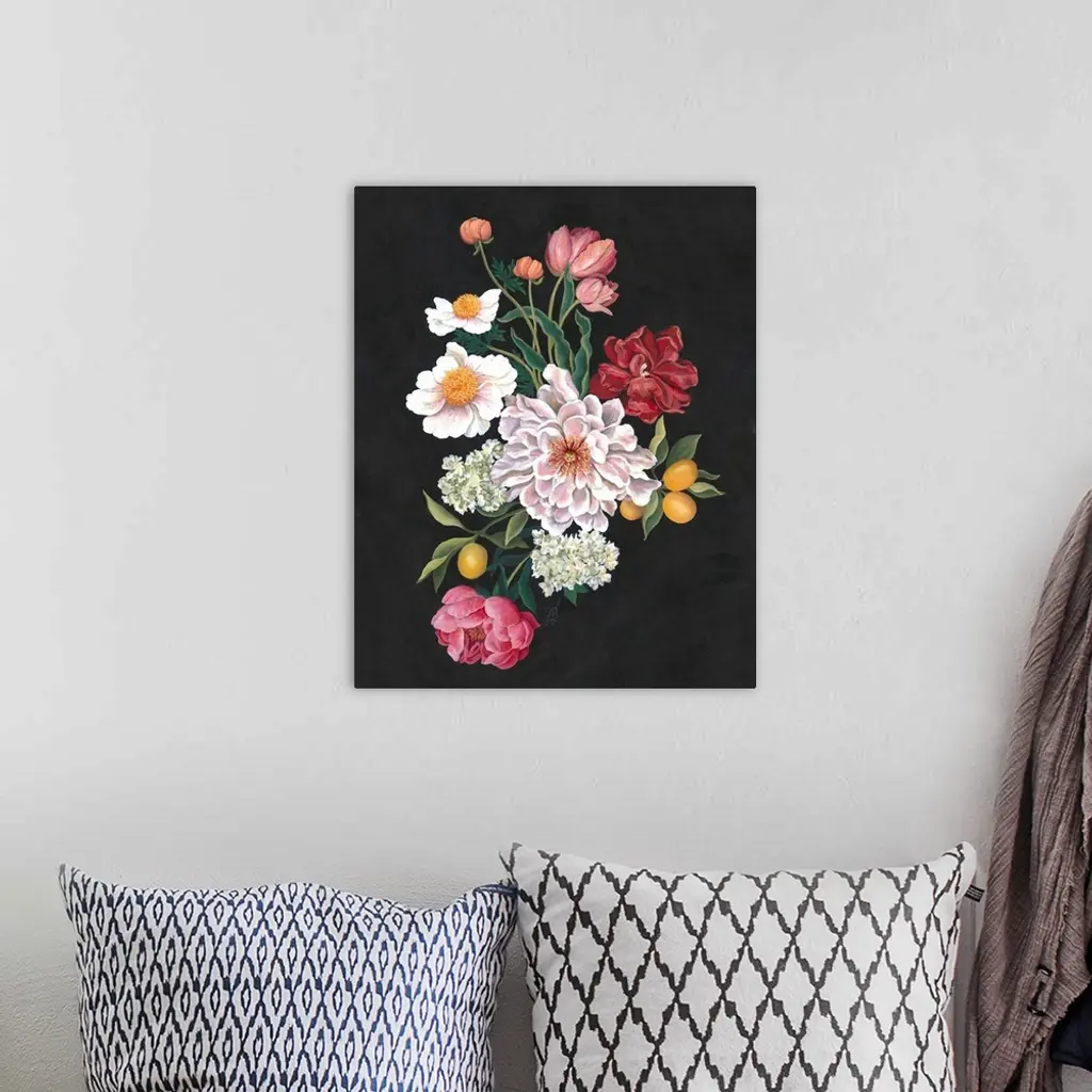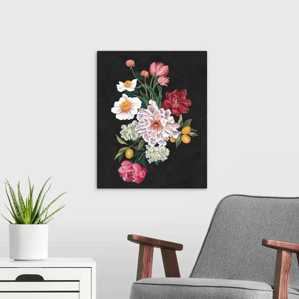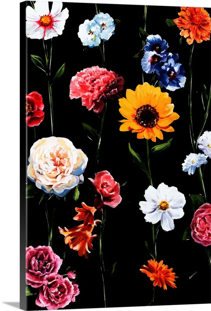 Vibrant flowers contrast beautifully against the dark backdrop.