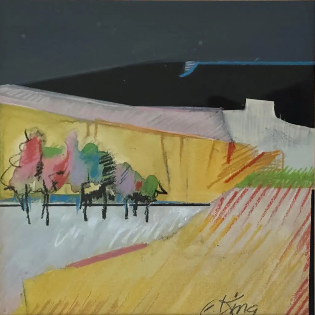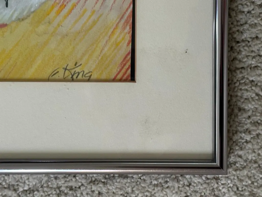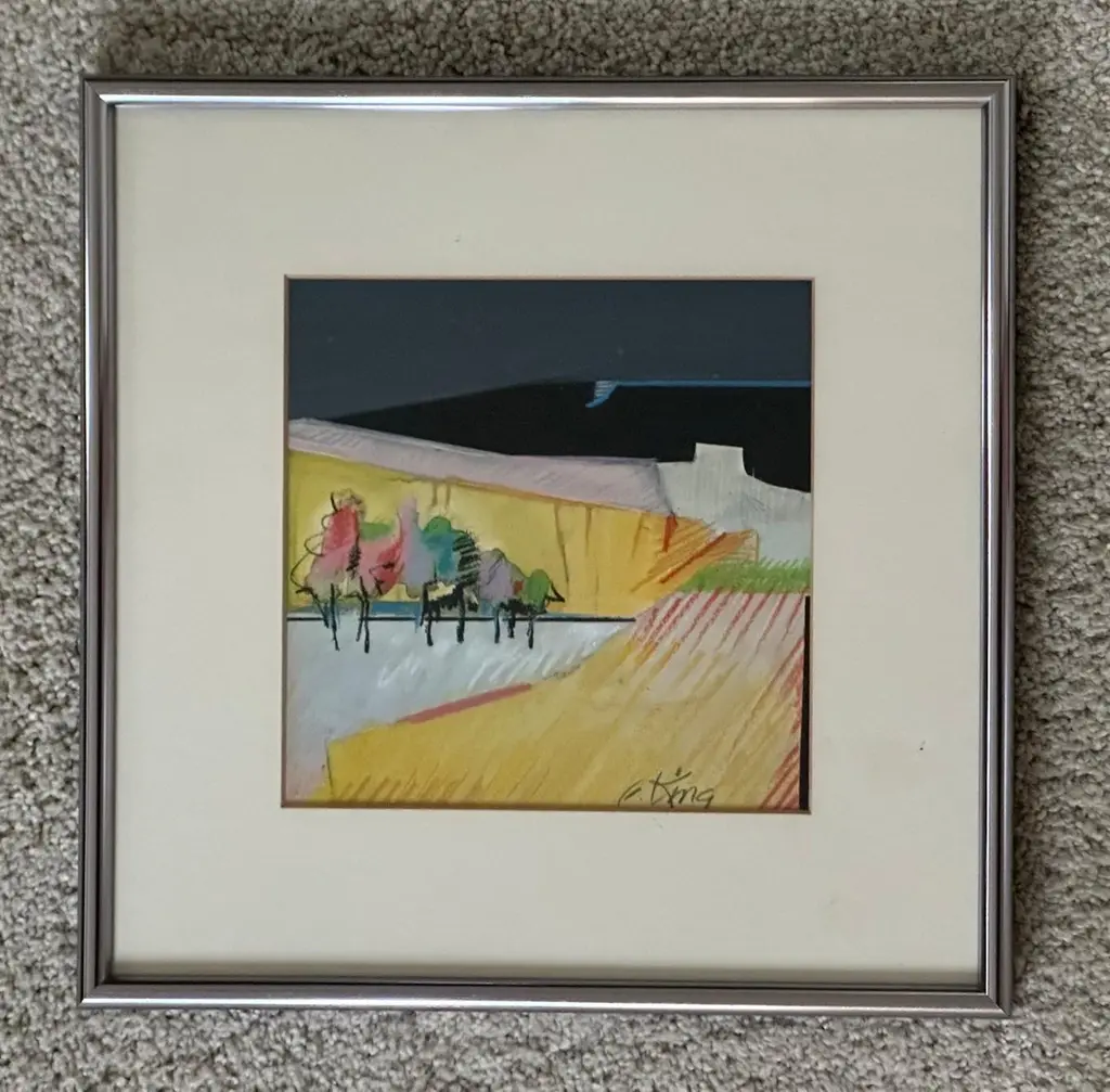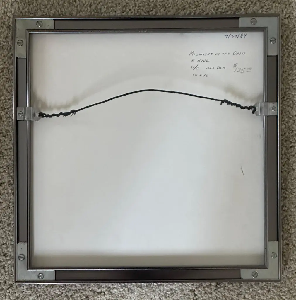 "Midnight at the Oasis" lithograph by E. King, circa 1984. The piece is in very good condition and is presented in a grey metal frame with an off white mat.. The framed piece is 10" x 10" while the image itself is 5.75" x 5.75". Cool piece! #4558